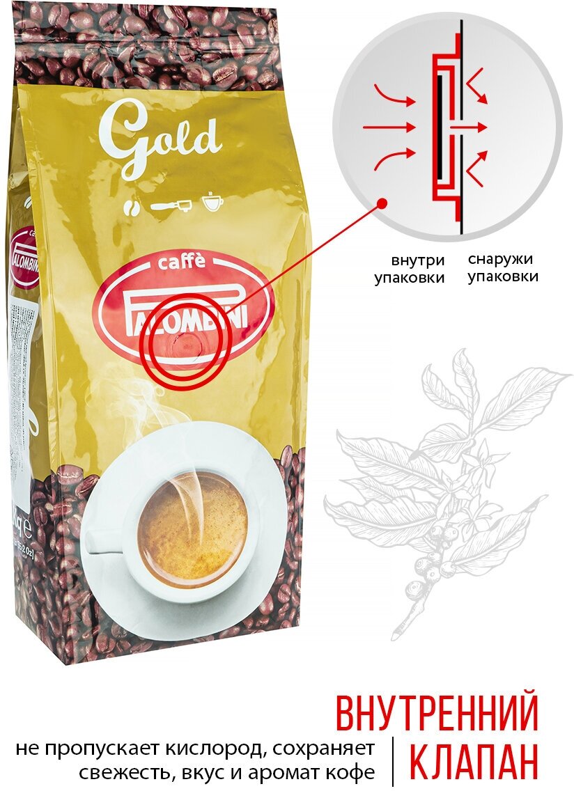 Кофе Palombini в зернах Gold качественная итальянская смесь в килограммовом пакете, которая идеально подойдет для владельцев ресторанного бизнеса и вендинговых аппаратов. В составе бленда преобладают отборные плоды арабики, которые дополняют зерна робусты. Кофейные сорта подверглись средней обжарке. В готовом напитке слышны ароматические отголоски ванильного сахара, пряностей и спелых тропических фруктов. Богатый вкус пестрит хорошо выраженными мотивами свежей выпечки, посыпанной шоколадной крошкой.