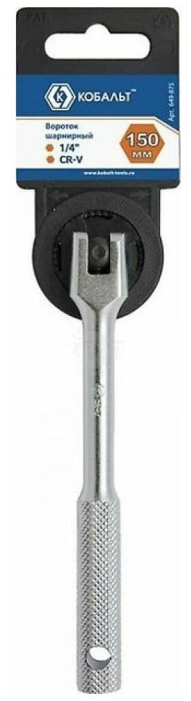 Вороток шарнирный кобальт 1/4", 150 мм для передачи вращательного движения торцевым головкам. Инструмент выполнен из качественной стали, которая обеспечивает износостойкость при больших нагрузках. Рифленая рукоятка улучшает захват ладони при эксплуатации.Характеристики: Посадочный квадрат: 1/4 дюйма Шарнирный механизм: есть Длина, мм: 150 Материал: CrV