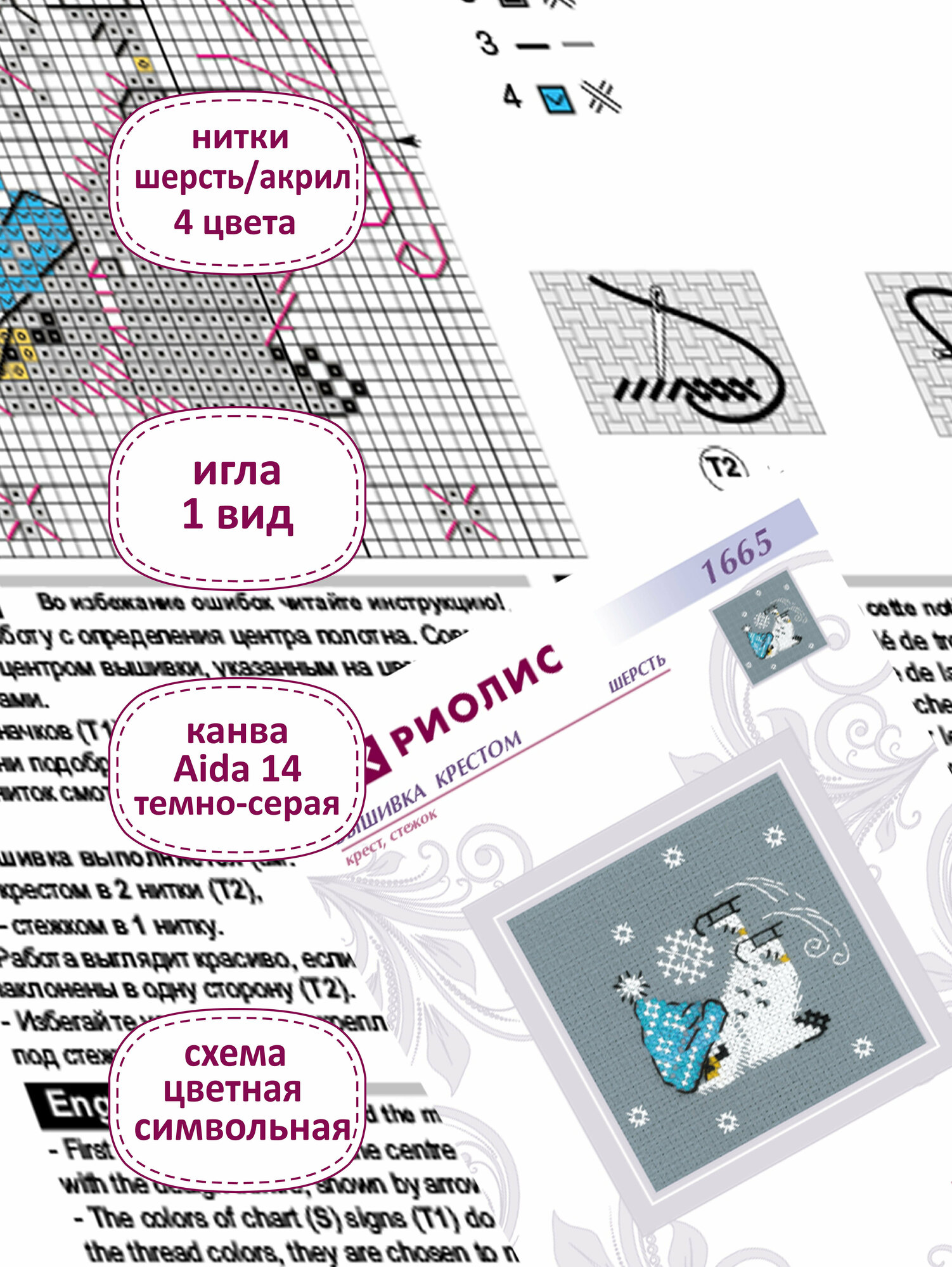 | В набор входит | канва Aida Zweigart 14 ct тёмно-серого цвета, мулине шерсть/акрил Safil (4 цвета), игла, цветная символьная схема, инструкция по вышиванию. |