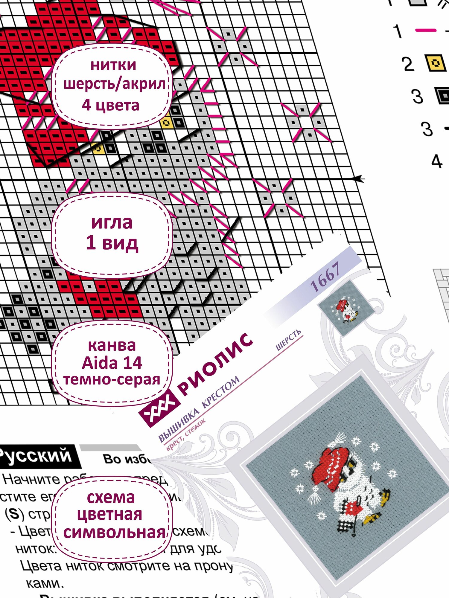 | В набор входит | канва Aida Zweigart 14 ct тёмно-серого цвета, мулине шерсть/акрил Safil (4 цвета), игла, цветная символьная схема, инструкция по вышиванию. |