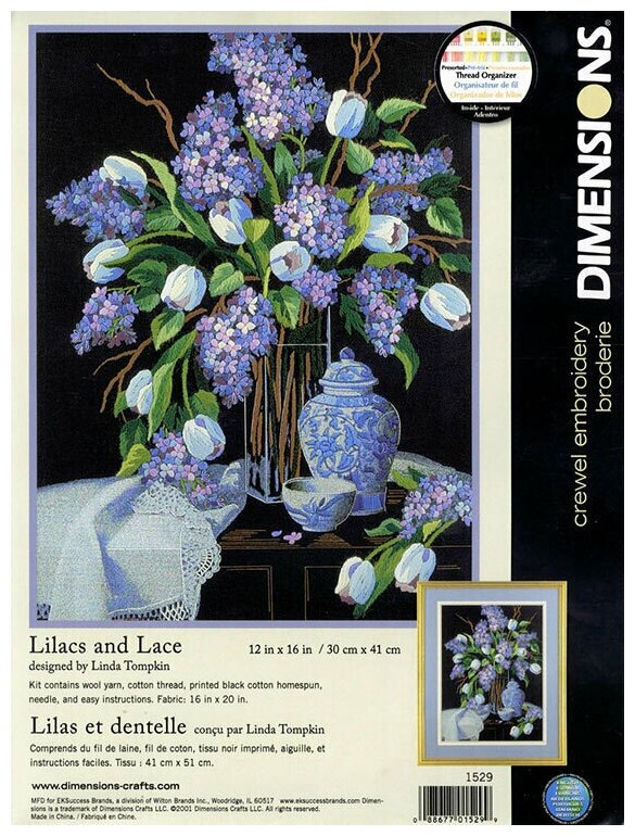 Проверенная временем фирма-производитель «Dimensions» постоянно выпускает замечательные наборы для вышивания. Тема «Сирень и кружево» не отклоняется от этого правила. Это бесспорно любопытный выбор, который послужит украшением интерьера вашего дома, а возможно даже станет его центром. Он сможет послужить чудесным подарком для ваших друзей и знакомых.Все, входящие в комплект материалы, качественны и комфортны в работе, что свойственно всей линейке продукции этой компании.Оконченная работа колоритно впишется в любой интерьер, а с выбором подходящей рамки композиция приобретет законченный вид. Удачи в реализации ваших идей!