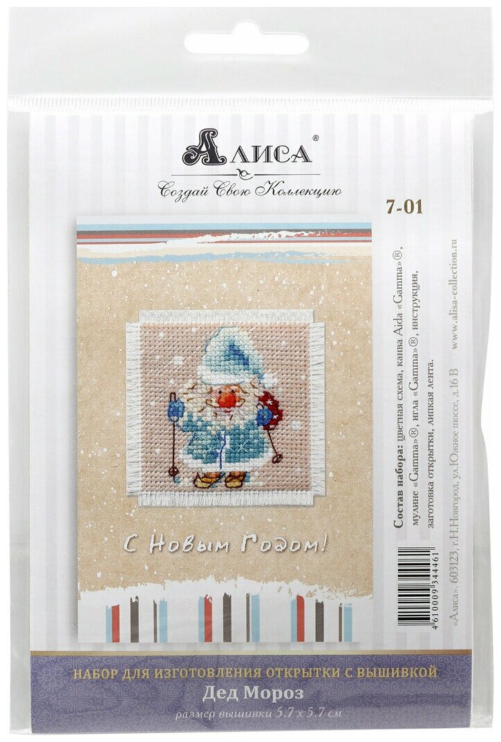 Вышивание - популярное и увлекательное хобби, которое дарит радость и умиротворение. Набор для вышивания - самый удобный вариант вышивок, как для начинающих, так и для опытных мастеров. Ведь набор содержит все необходимые материалы для создания настоящего шедевра. Отличный результат гарантирован! Вышивке всегда можно найти практическое применение. А вышитая собственноручно готовая картина станет отличным подарком близкому человеку. Она будет радовать долгие годы, даря любовь и тепло. Набор для вышивания "Алиса" 7-01 Открытка "Дед Мороз" 5.7 х 5,7 см. Тип ниток: хлопковые. Заполнение: Частичное. Количество цветов: 17. Праздник: Новый Год. Схема: Цветная. Тема: Зимнее настроение. Техника исполнения: Счетный крест. Тип канвы/ткани: К16 Aida №16 "Gamma". Цвет канвы/ткани: белый. Размер готовой работы: 5.7 x 5,7 см.