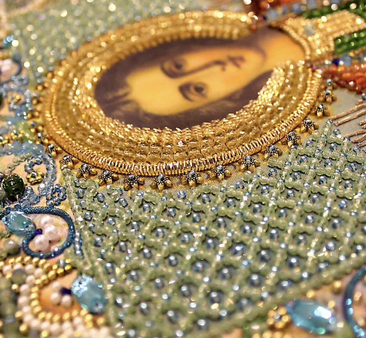 | В набор входит | плотная атласная ткань с нанесенной авторской схемой, агат, нефрит, хрустальные бусины, жемчуг(акрил), винтажные звездочки, металлические бусины, пришивные стеклянные стразы, металлическая тесьма, ювелирный бисер ТОХО, бисер (Чехия), трунцал, канитель, игла, плакат со схемой расположения бусин и пошаговой инструкцией с фотографиями, подарочный пакет с фотографией вышитой иконы |