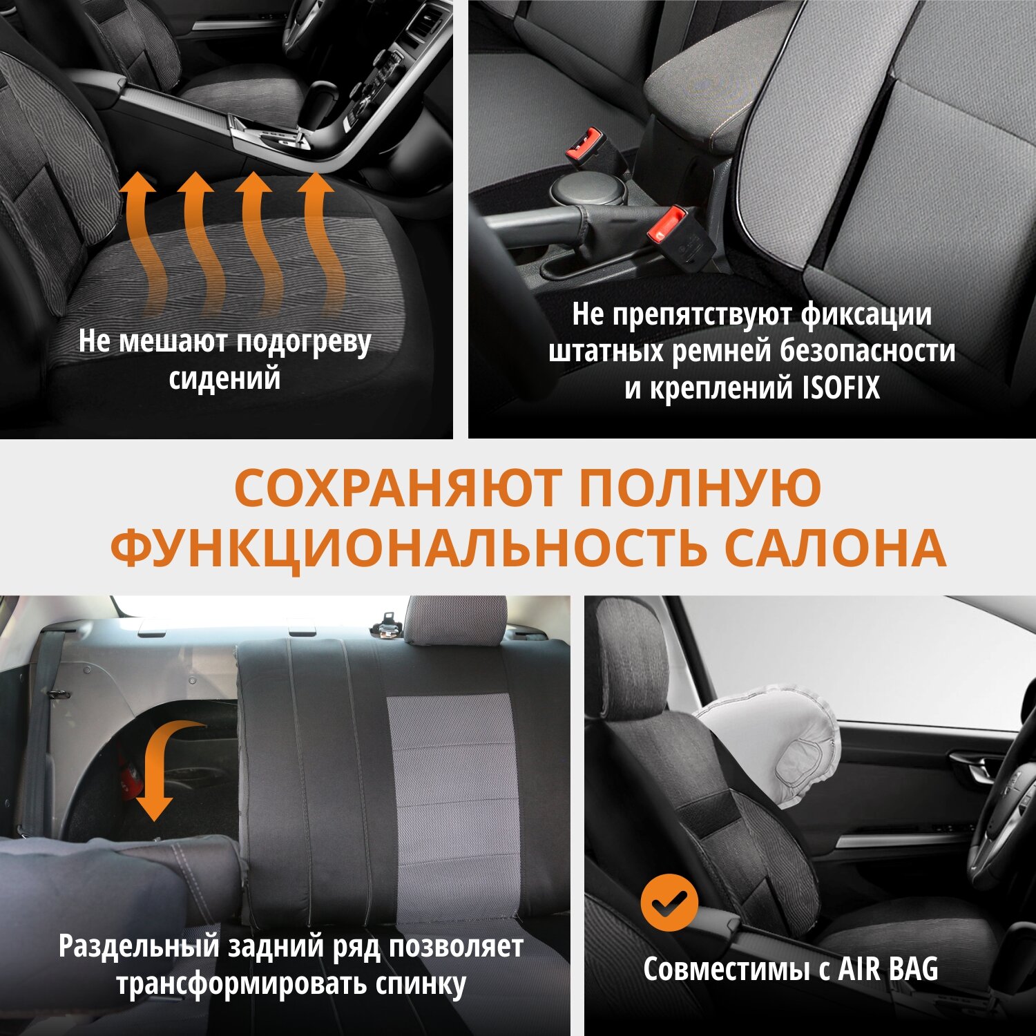 2 передних спинки 2 передних сиденья 1 задняя спинка 1 заднее сиденье 5 подголовников3 молний на задней спинке 3 молний на заднем сидении Комплект крепежа для установки