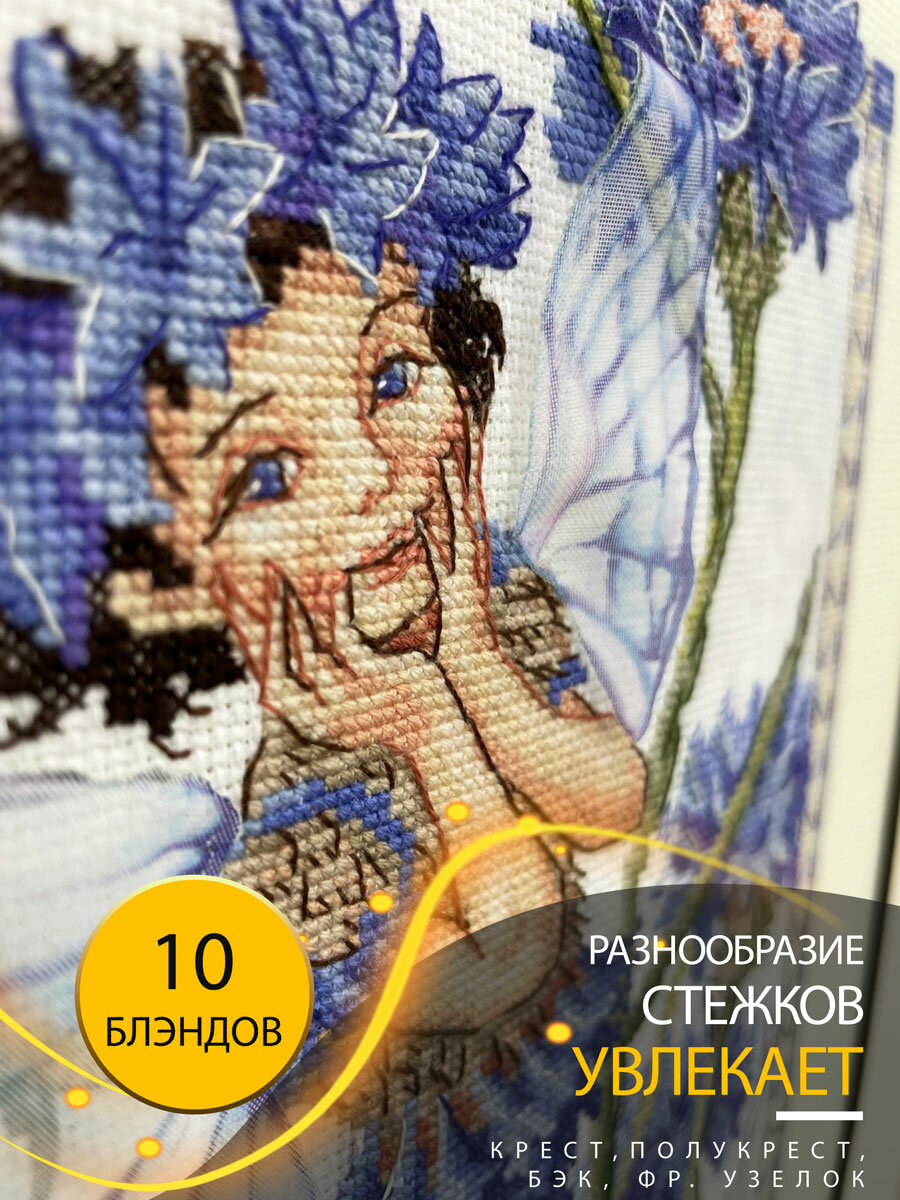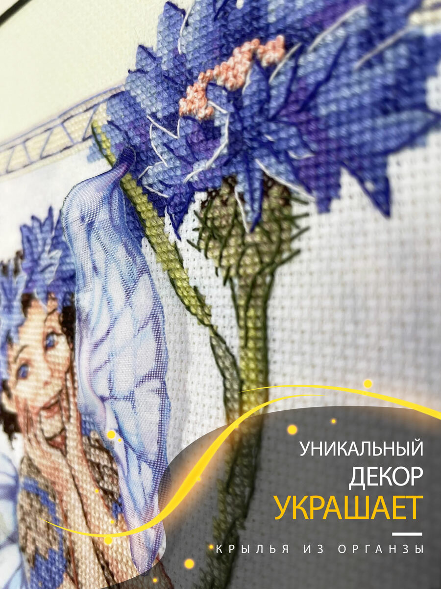 Набор включает в себя все необходимое для вышивания: канва № 18 Aida Zweigart (фон напечатан), нитки мулине DMC (Франция), леска, декоративные элементы (крылья), две иглы, схема для вышивания, инструкция по вышиванию.