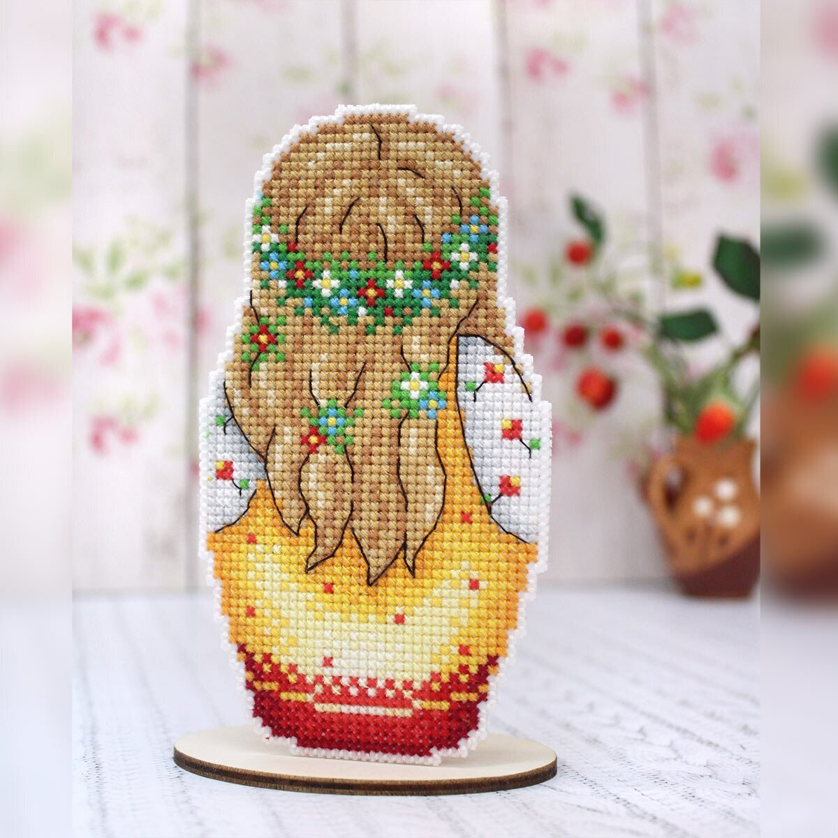 Чтобы вышить такую игрушку, достаточно владеть техникой 'крест'. Пяльцы или рамки не понадобятся – пластиковая канва отлично держит форму. Готовые элементы надо вырезать по контуру и соединить между собой аккуратными стежками. При желании между деталями игрушки можно вклеить или вшить ленту-подвес, кроме того, сувенир можно установить на деревянную подставку подходящего размера.