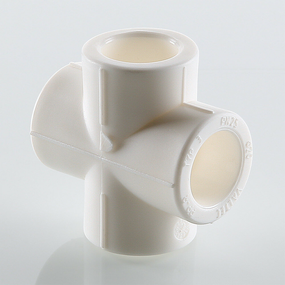Фитинг 40 мм для соединения четырех полипропиленовых труб равного диаметра (крестовина). Монтаж производится методом раструбной сварки.