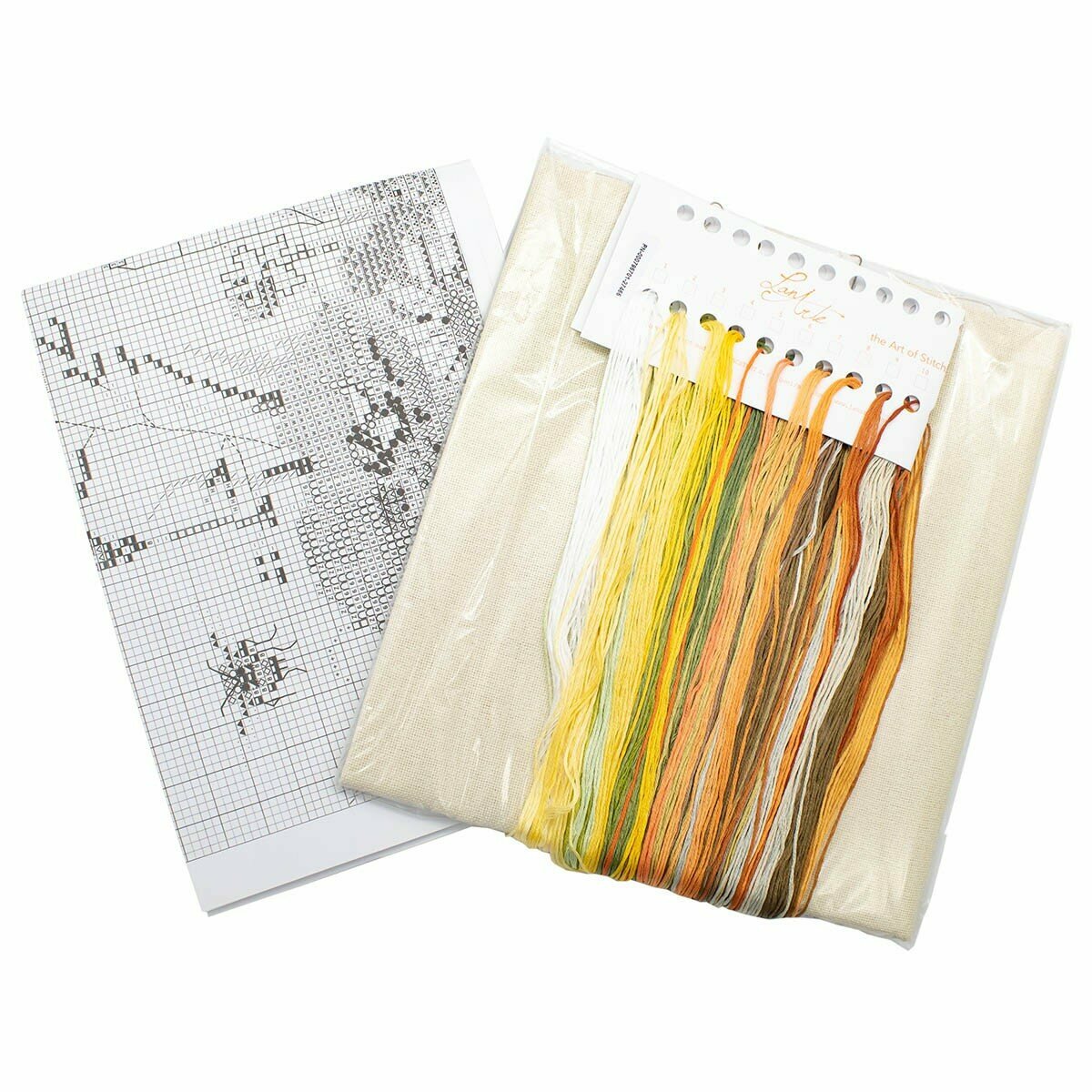 В наборе: ткань для вышивания хлопок, хлопковые мулине DMC, черно-белая схема, игла, инструкция. Мулине разобраны на бумажном органайзере. Размер: 57х32 см.
