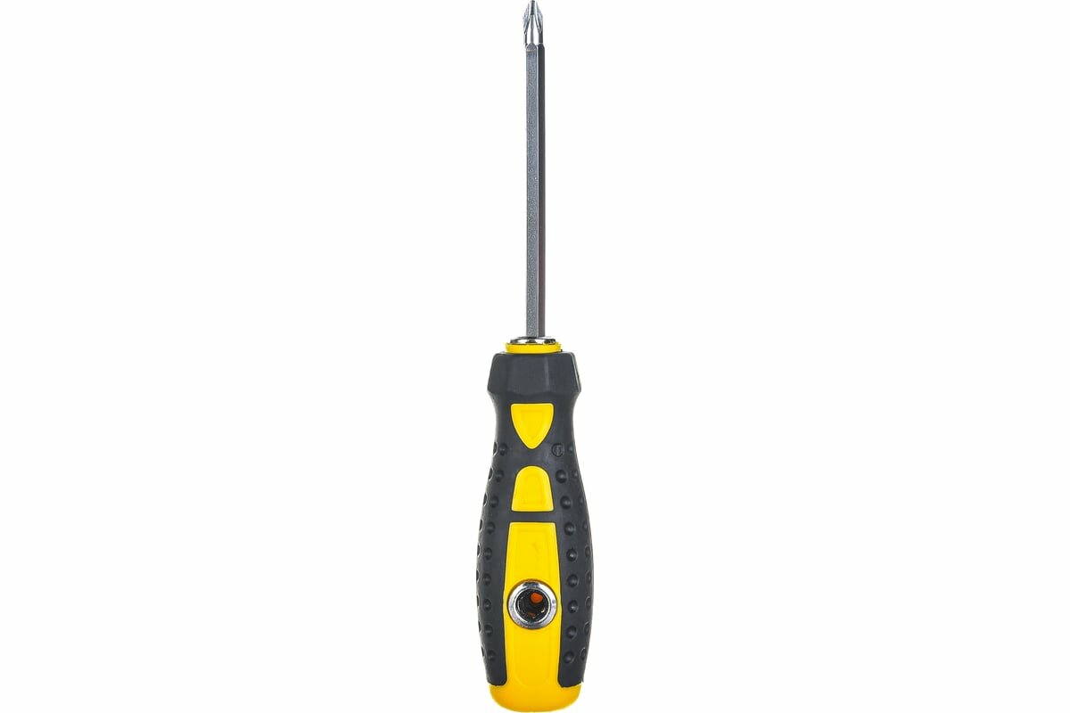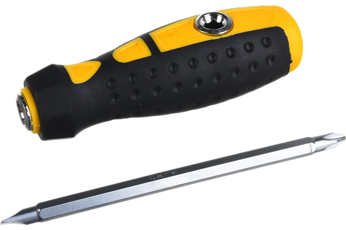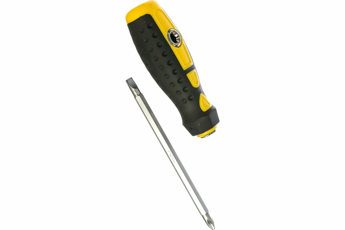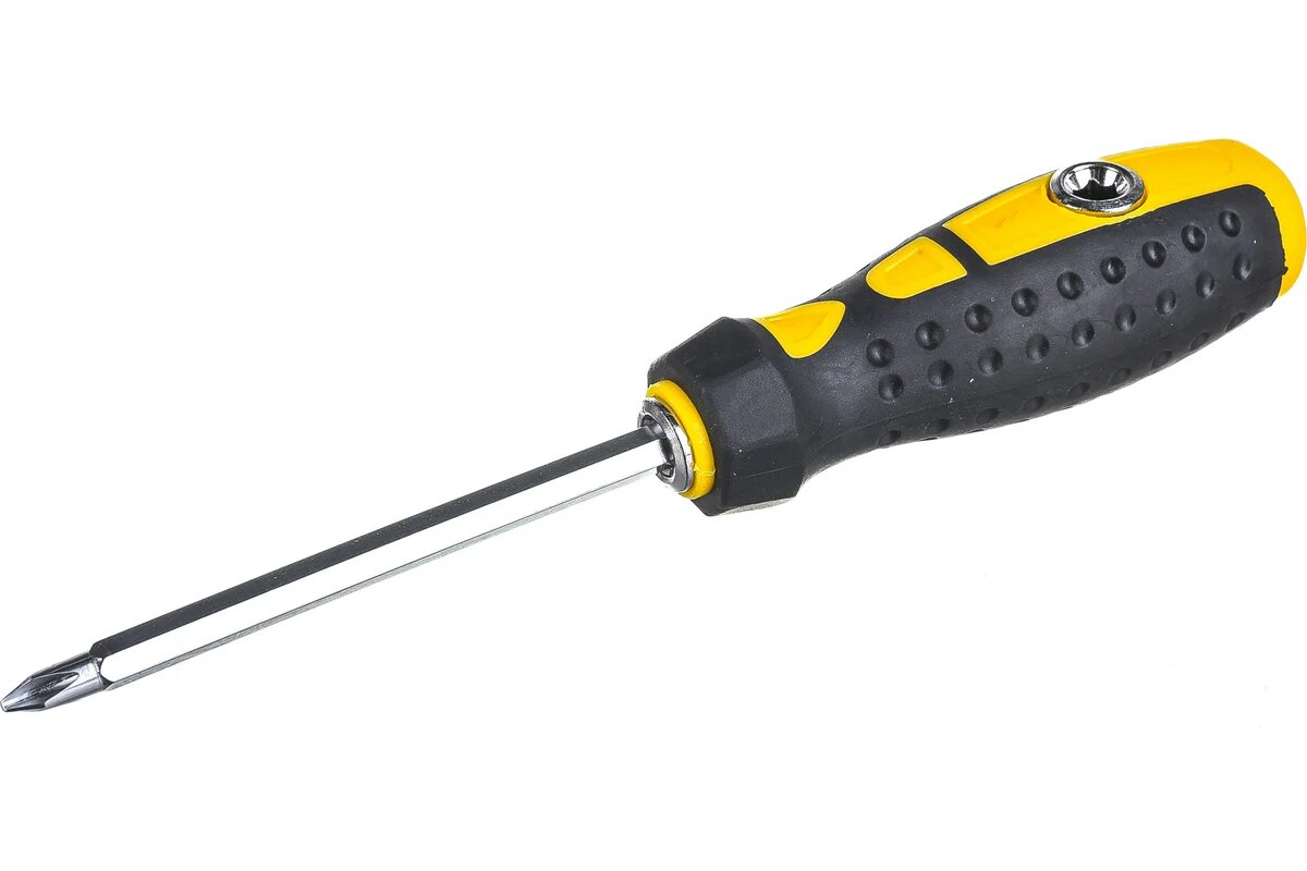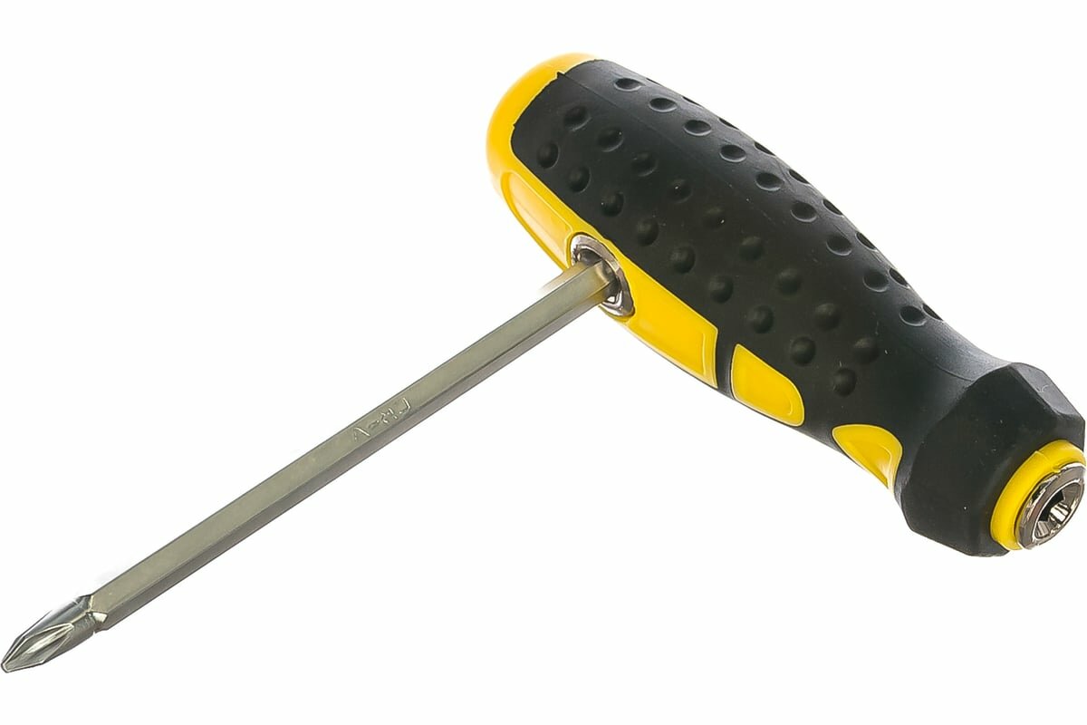 С переставным жалом. С дополнительным установочным отверстием на ручке для работы в качестве Т-образной отвертки, что позволяет снизить нагрузку при работе. Материал: жало из хром-ванадиевой стали, пластиковая прорезиненная ручка. Упаковка: блистер.