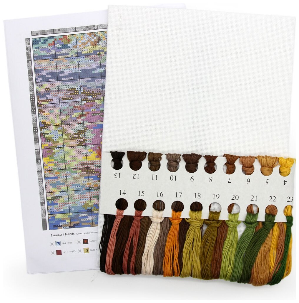 | Комплектация | Канва Aida Zweigart 18 ct, хлопковые нитки мулине, цветная символьная схема, игла, инструкция. |
