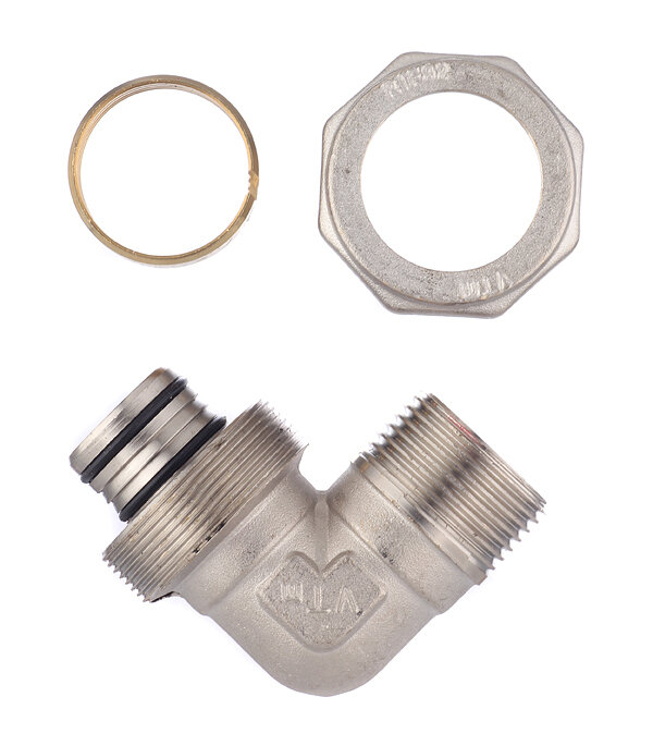 Фитинг 32х1" обжимной – угольник с переходом на наружную резьбу для металлополимерных (металлопластиковых) трубопроводов. Резьба фитинга – наружная трубная по ГОСТу 6357.