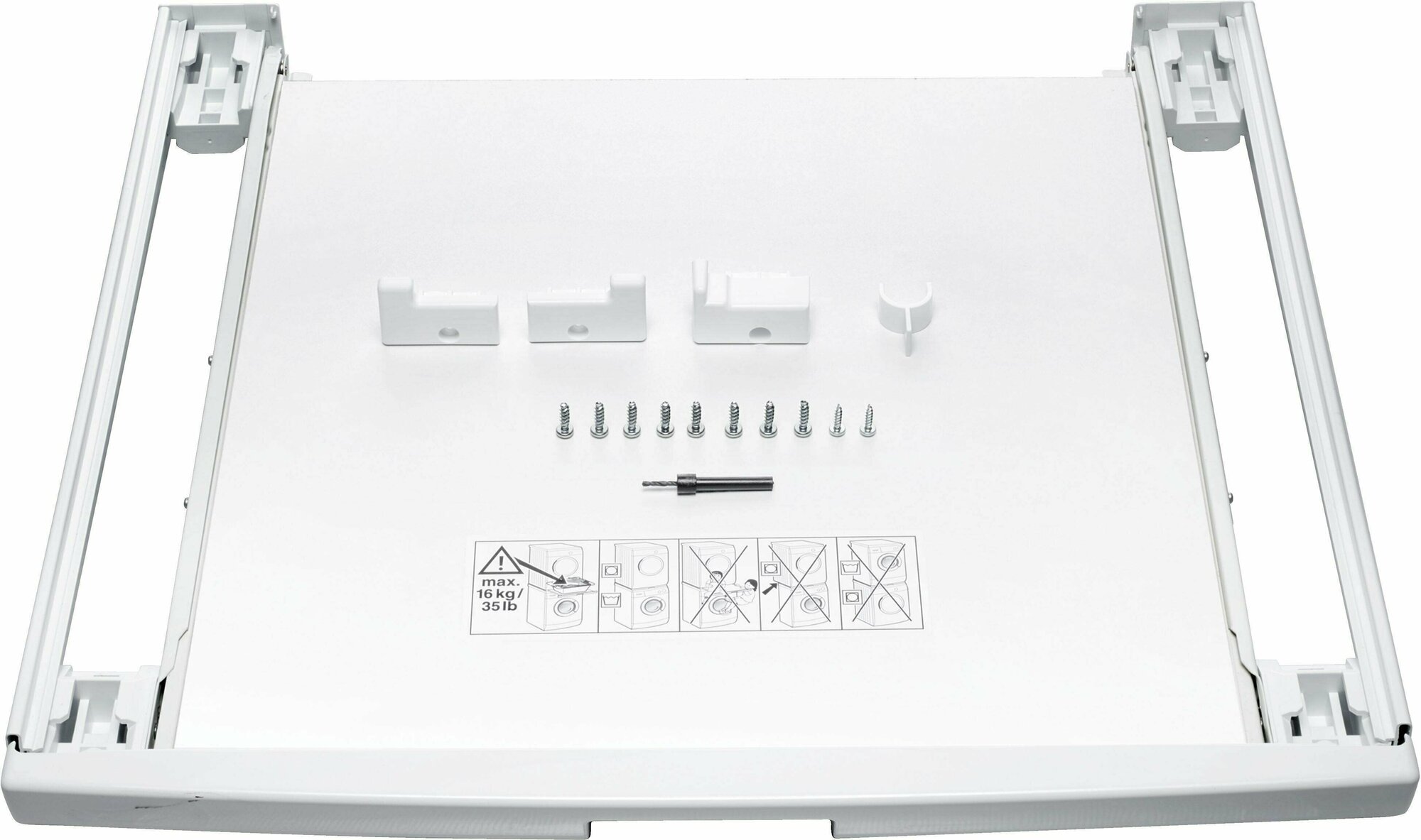 Главный принцип компании Bosh «потребности клиентов стоят выше интересов исполнителей, но не выше качества». Данный элемент расширяет свободное пространство, позволяя значительно его экономить, что особенно важно для маленьких квартир. Закрепляя сушку над стиральной машиной и создавая колонну, соединительный элемент Bosch формирует органичный функциональный тандем, благодаря которому не повреждаются стиральные аппараты, а конструкция гарантированно устойчива. Полочка так же имеет немаловажную роль, благодаря ей загрузка и выгрузка белья из сушильного барабана становится намного удобней и проще. Совместим для сушильных машин WTB/WTY