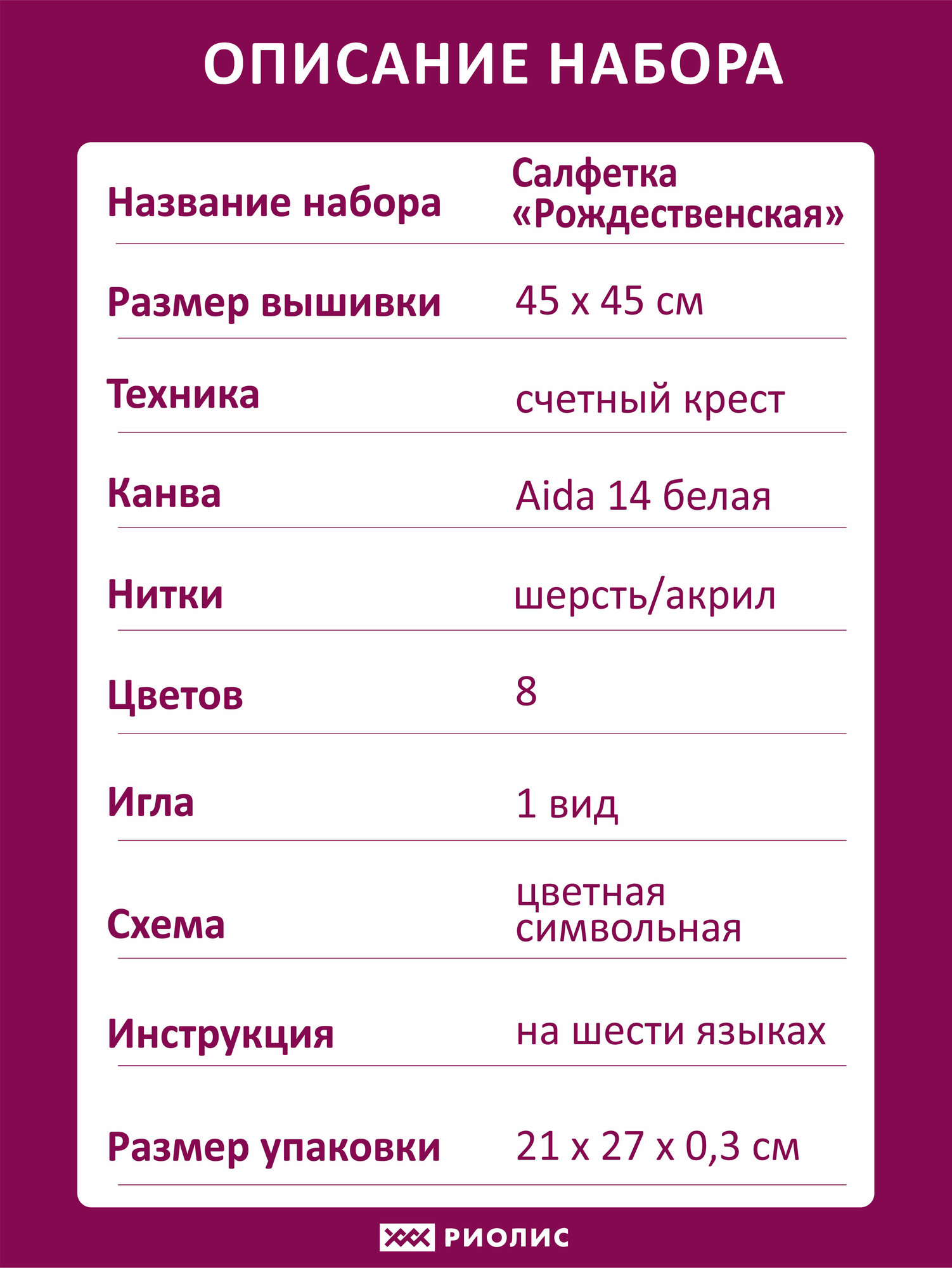 Продажа от производителя! В состав комплекта входит канва белая без нанесённого рисунка 14 каунта, нитки шерсть/акрил 8 оттенков, а также простая для понимания цветная символьная схема и качественная игла. Габариты готовой работы 45х45 см. Используется техника счетный крест, полукрест, стежок. Конечно же, главное украшение новогоднего интерьера - это душистая наряженая елка, но и украшение праздничного стола - немаловажная вещь. Как здорово готовиться к долгожданным праздничным каникулам и делать тематические поделки своими руками. Вышивка рождественской салфетки создаст прекрасное настроение и добавит особый уют вашему дому. Прилагается игла для вышивания крестиком нужного размера, чтобы обеспечить легкость и точность шитья. Благодаря подробной схеме и приложенной инструкции работа с картиной будет лёгкой и приятной! Набор подходит для праздничных поводов, таких как День рождения, Рождество, Новый год. Оформленная картина послужит прекрасным презентом для мамы или бабушки. Продукция бренда риолис - оптимальное решение для тех, кто ищет изделие высокого качества, любит творчество и хочет попробовать себя. В нашем ассортименте найдутся варианты на любой вкус, как для опытных искусниц, так и для начинающих вышивальщиц, для детей и взрослых. От маленьких уникальных сюжетов до больших картин и репродукций. Риолис - ваш идеальный выбор!