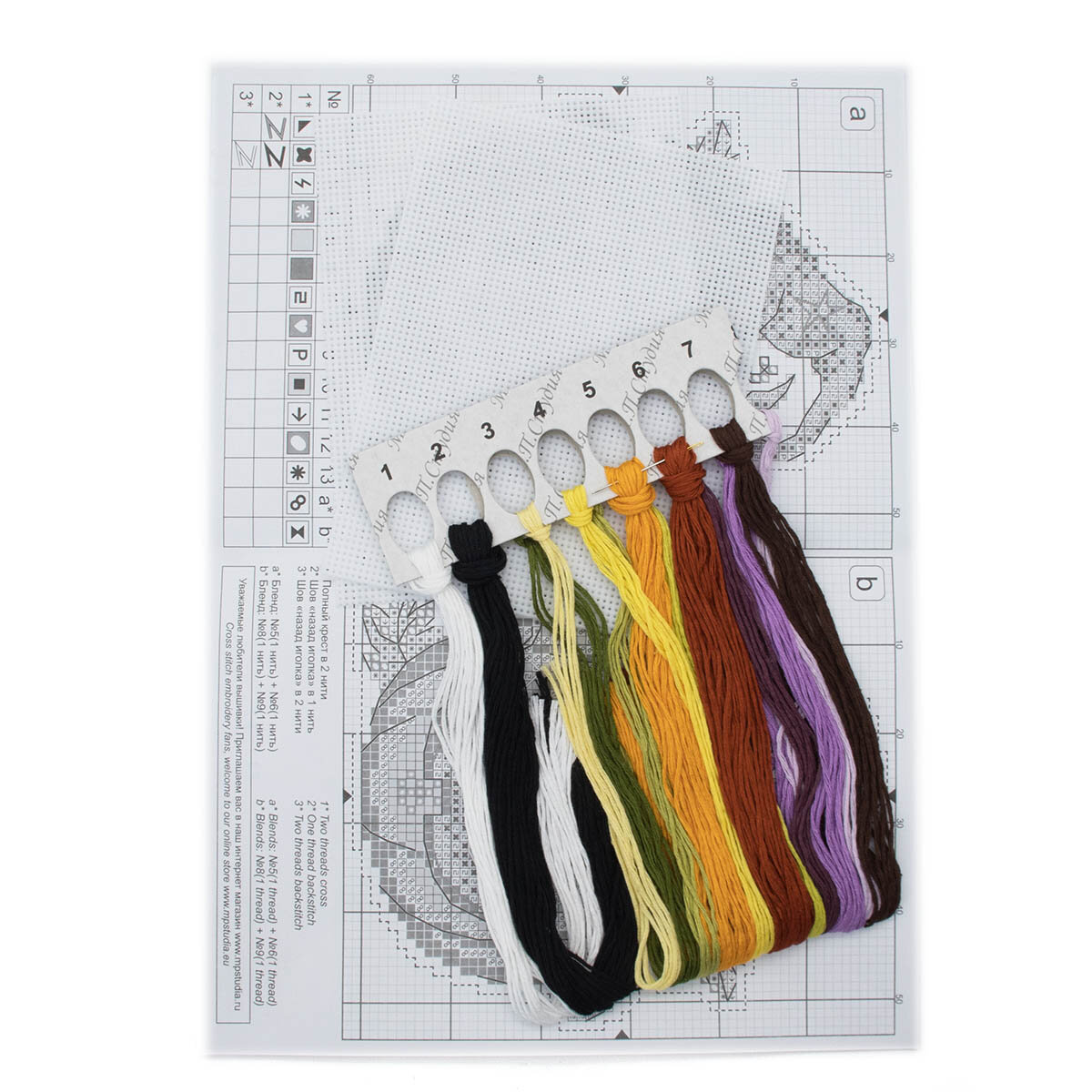 В наборе: пластиковая канва, нитки мулине, схема, подробная инструкция.