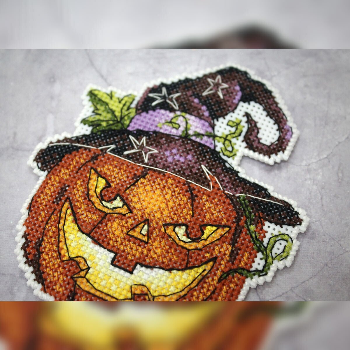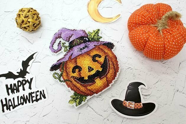 Создайте яркий вышитый сувенир 'Праздничная тыква' – это увлекательно и просто, достаточно владеть техникой 'крест' и точно следовать инструкции. Пяльцы или рамки не понадобятся – пластиковая канва отлично держит форму. Готовые элементы надо вырезать по контуру и соединить между собой аккуратными стежками. При желании между деталями игрушки можно вклеить или вшить ленту-подвес. Кроме того, сувенир можно установить на деревянную подставку подходящего размера.