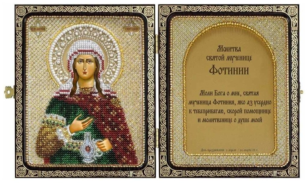 Набор для вышивания ТМ "Нова Слобода" СЕ 7110 "Св. Прп. Светлана ". В набор входит: бисер PRECIOSA №10 - 1 цвет и PRECIOSA №13 - 9 цветов, основа для вышивания Perfostitch - высокопрочный материал с перфорацией и нанесенным рисунком-схемой, рамка-складень, игла для вышивания бисером, нить для вышивания бисером, цветная схема, инструкция.