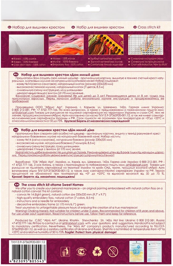 | В набор входит | Канва №14 (светло-салатовая), натуральный хлопок, размер 220х220 мм, высококачественное мулине, натуральный хлопок (7 цветов, 8,5 м, схема-инструкция, игла для вышивки, декоративные пяльцы с винтом (d170 мм). |