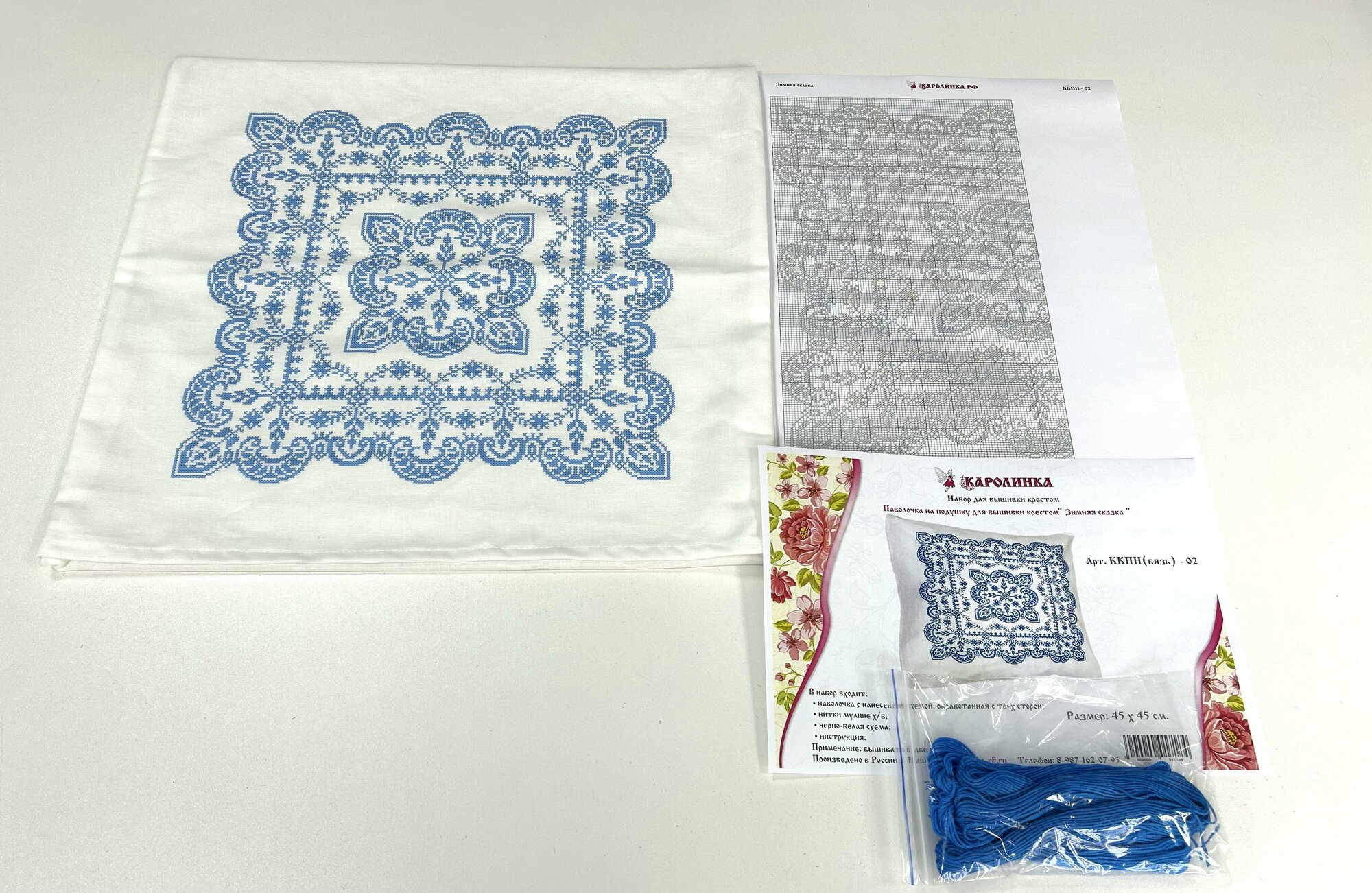 | В набор входит | Наволочка с нанесенной схемой,обработанная с трех сторон; нитки мулине х/б, черно белая схема на бумаге, инструкция |