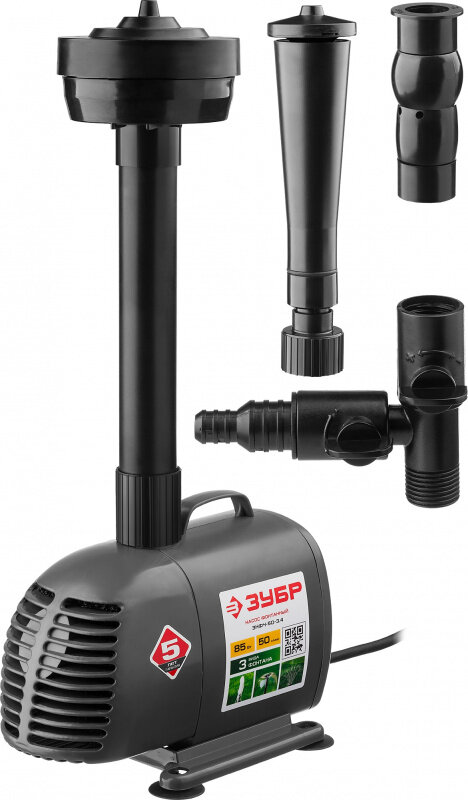 | Прочие особенности и свойства | Насос ЗУБР ЗНФЧ-50-3.4 фонтанный, для чистой воды, напор 3,4м, насадки:колокольчик, гейзер, водопад, 85Вт, 50л/мин. Насос фонтанный ЗУБР ЗНФЧ-50-3.4, предназначен для украшения водоемов фонтаном с различными типами струй, а также водопадом. Могут использоваться для перекачки чистой и загрязненной воды из водоемов с учетом технических характеристик модели. Три формы фонтанной струи - гейзер, колокольчик, каскад. Плавная регулировка струи колокольчик и легкая смена типа фонтана. Идеально подходит для небольших прудов. Удлинительная трубка в комплекте позволяет отрегулировать высоту основания фонтана. Конструкция не требует обслуживания, кроме периодической промывки фильтра. Надежное крепление к плиточному или пластиковому дну водоема обеспечат присоски. Губчатый фильтр для защиты насоса от попадания частиц грязи. Возможность организации водопада. |