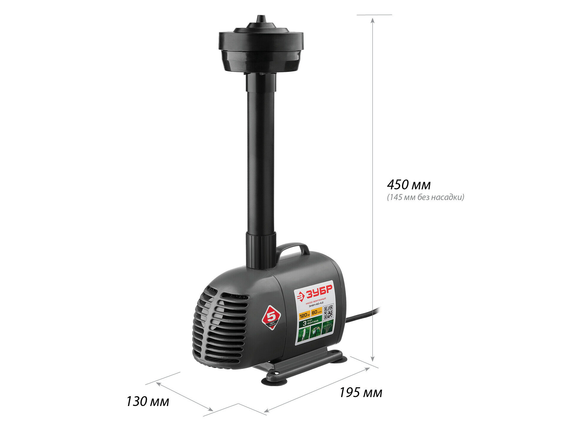 | Прочие особенности и свойства | Фонтанный насос «ЗУБР» – это простое решение для украшения Вашего участка. С его помощью любой водоем превращается в водопад или фонтан с различными формами струй:«гейзер», «каскад» и «колокольчик». Надежная неприхотливая конструкция и корпус из высококачественных материалов гарантируют долгий срок службы изделия. • Плавная регулировка струи и легкая смена типа фонтана • Удлинительная трубка в комплекте позволяет отрегулировать высоту основания фонтана • Конструкция не требует обслуживания, кроме периодической промывки фильтра • Губчатый фильтр для защиты насоса от попадания частиц грязи • Соединительный штуцер 1/2” или 1” • Надежное крепление к плиточному или пластиковому дну водоема обеспечат присоски • Возможность организации водопада • Идеально подходит для небольших и средних прудов Типы струи 3 (каскад 125–175 см, гейзер 40–50 см, колокольчик 75–90 см) |