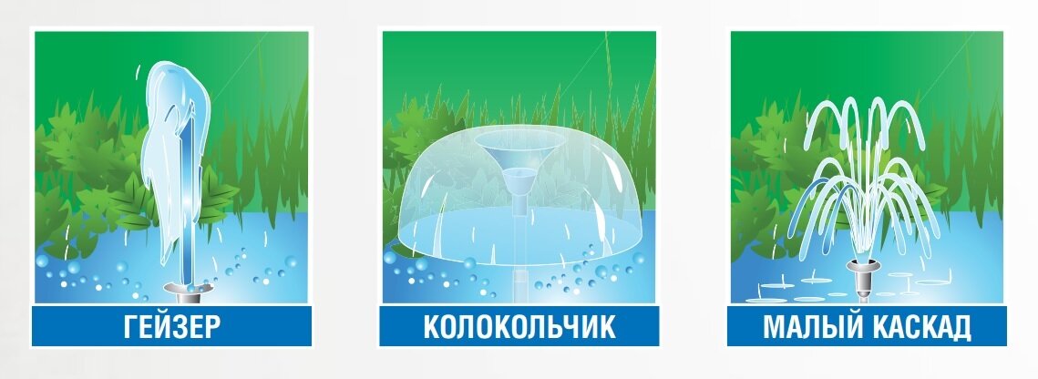 | Особенности | Три формы фонтанной струи-гейзер, колокольчик, каскад. Регулировка струи "колокольчик" и легкая смена типа фонтана. Возможность организавать водопад. Удлинительная трубка в комплекте. Крепление к плиточному или пластиковому дну водоема. Губчатый фильтр для защиты насоса от попадания частиц грязи. |