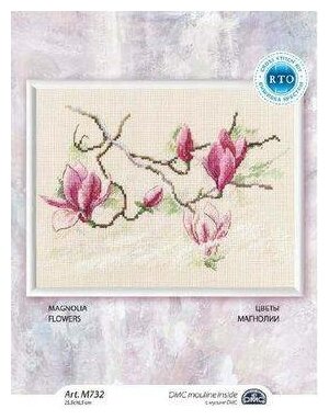 Набор РТО Цветы магнолии. В набор Цветы магнолии входит все необходимое для творчества и рукоделия: канва для вышивания Aida 14 ct серо-бежевого цвета (100% хлопок), мулине DMC (100% хлопок) разобранное по цветам на органайзере, символьная схема, игла, подробная инструкция по вышиванию. Размер: 25.5x16.5 см. Зашивка: не полная. Бренд: РТО. Артикул: M732