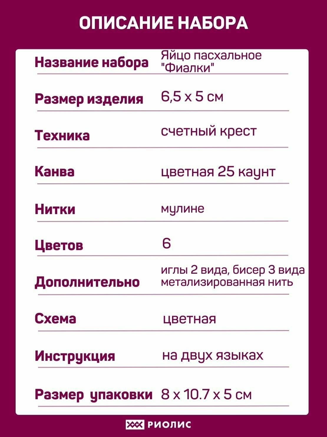 | Наименование модели | RIOLIS Яйцо пасхальное, "Фиалки", 6х4,5 см |