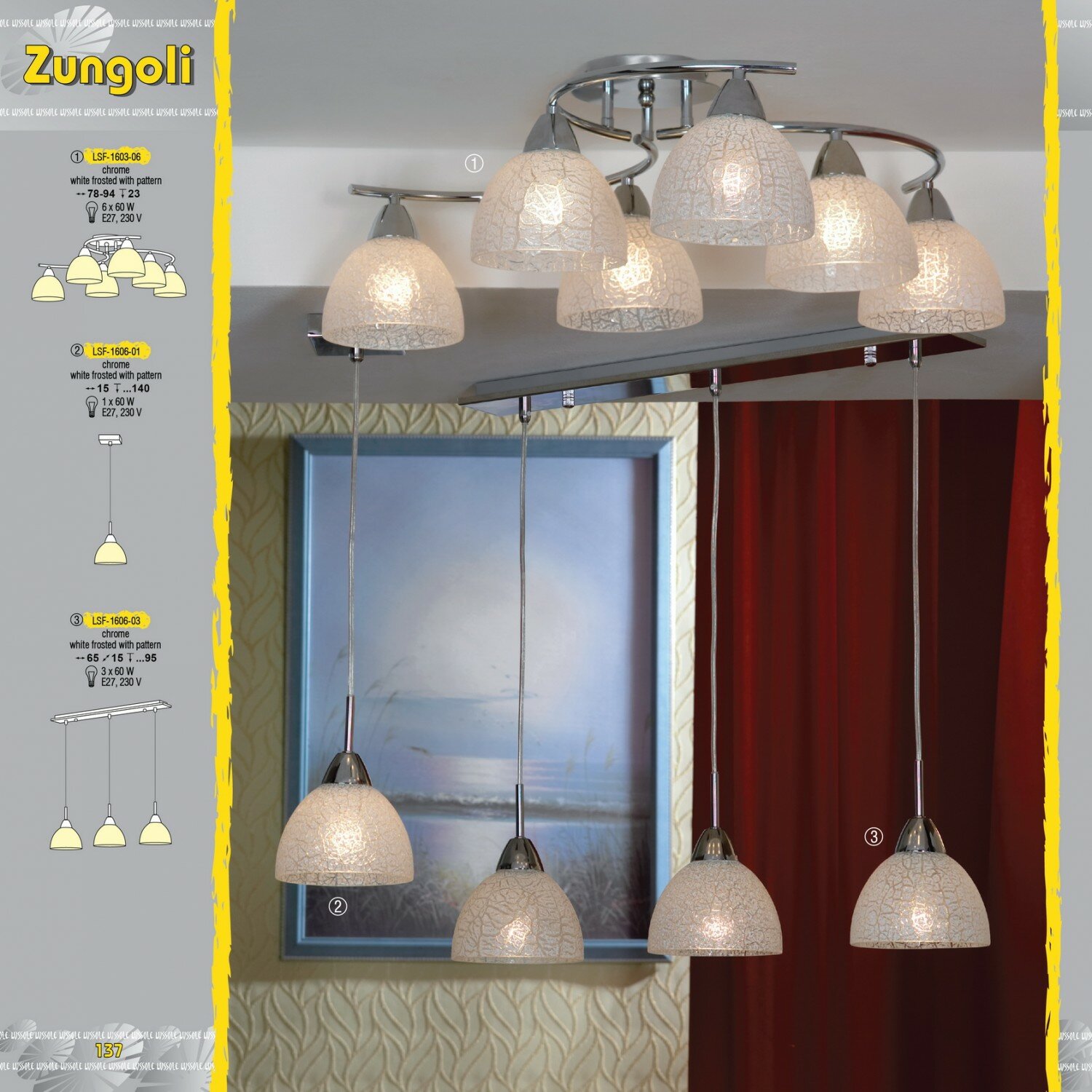 Известный своими дизайнерскими находками бренд Lussole из Италии время от времени не отказывает себе в удовольствии выложить на прилавки довольно простую и унверсальную модель. Из таких сплошь состоит серия Zungoli. Компактная накладная люстра оптимальна для небольших помещений с низким потолком: в таких при ее использовании в качестве основного источника освещение будет плотным, легким и ненавязчивым. Отсутствие декоративных деталей и легкость ухода делает возможным монтаж светильника в коридорах, кухнях, ванных комнатах.