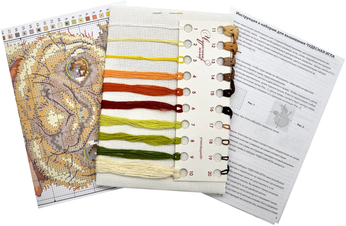 | В набор входит | Нитки мулине - 100% хлопок, игла для вышивания, канва Аида 14 белого цвета, цветная схема для вышивания, краткая инструкция на русском языке |