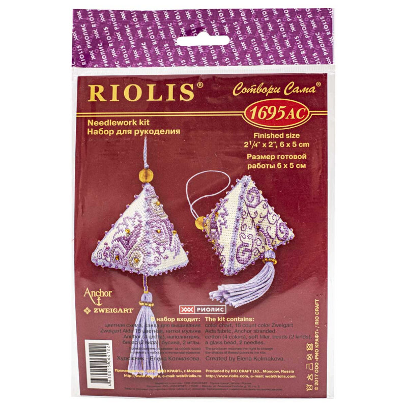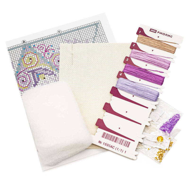 В наборе: канва Aida 18, нитки мулине Anchor, бисер, бусины, синтетический наполнитель, игла, цветная схема, инструкция.