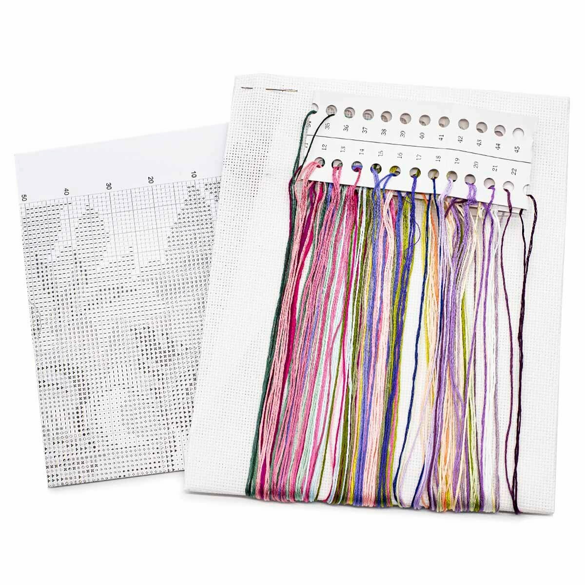 В упаковке: канва Aida 14 белая без нанесенного изображения, набор хлопковых нитей мулине, игла, схема для вышивания, инструкция.