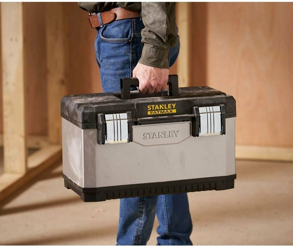Stanley - металлопластмассовый профессиональный ящик для каменщиков, бетонщиков, электриков, сантехников, маляровдекораторов, плотников, специалистов в области вентиляции и кондиционирования, работе по гипсокартону, штукатуров, плиточников и укладчиков напольных покрытий. Подходит для работы с трубами и пиломатериалами. Конструкция позволяет с легкостью переносить большую нагрузку. Данная модель имеет переносной лоток для транспортировки инструмента и мелких деталей, при этом в ящике остается место под крупный инструмент, поскольку длина лотка меньше длины ящика. Ящик Stanley снабжён V-образным пазом в крышке для удобства расположения детали при пилении. Сочетание преимуществ пластика с прочностью металла обеспечивают максимальную защиту содержимого. Большие металлические с защитой от коррозии замки имеют возможность использования навесного замка. имеет инновационный съемный вертикальный органайзер для более удобного размещения инструмента.