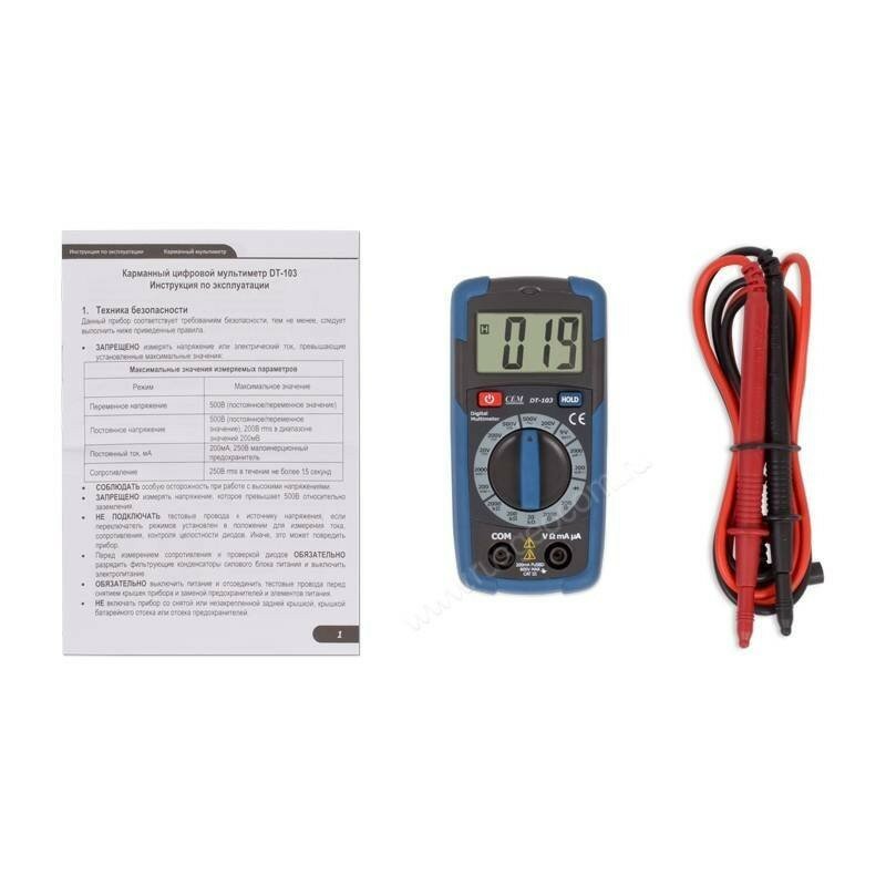 | Описание | Цифровой мультиметр CEM DT-103 – это карманный измерительный прибор, используемый для измерения постоянного тока, постоянного и переменного напряжения, сопротивления, а также для тестирования диодов и прозвонки электрических цепей. Эта компактная бюджетная модель проста в управлении, многофункциональна и удобна. Разрядность дисплея:3 1/2; Максимально индицируемый параметр измерений:2000; Постоянный ток |