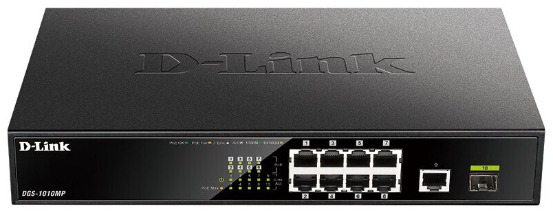 Коммутатор D-Link DGS-1010MP, оснащенный 9 портами 10/100/1000Base-T (8 портов поддерживают Power over Ethernet (PoE)) и портом 1000Base-X SFP, предназначен для малого бизнеса и позволяет подключать и подавать питание по Ethernet-кабелям на такие устройства, как PoE-совместимые беспроводные точки доступа, сетевые камеры или IP-телефоны. Данный коммутатор оснащен пассивной системой охлаждения, которая обеспечивает бесшумную работу устройства, что позволяет поместить его практически в любой комнате или офисе.