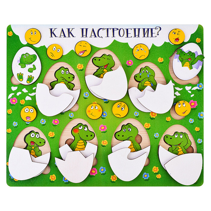 Деревянная доска «Как настроение?» - это игровая панель для развития мелкой моторики, внимания, воображения и усидчивости Вашего малыша, с помощью которой в увлекательной игровой форме ребенок познакомится с такими понятиями как чувства, эмоции и настроение и их мимическими проявлениями, научится составлять предмет из его частей, размещать вкладыши в ячейках в соответствии с их контурами и узнает много интересного из жизни крокодилов.Предложите ребенку внимательно рассмотреть смайлики на игровой доске, попросите найти сердитый, задумчивый, грустный, радостный, испуганный и т.д. Помогите малышу, если он затрудняется с ответом. Вместе посмотрите, кто спрятался под яйцами. Как можно охарактеризовать настроение каждого крокодильчика? В чем это проявляется? Достаньте все вкладыши из ячеек, разложите крокодильчиков на столе и предложите ребенку самостоятельно подобрать к каждому из них смайлик с соответствующим выражением лица. В процессе игры задавайте вопросы: когда мы пугаемся, когда сердимся, что мы делаем, когда нам весело или грустно? Вместе придумайте истории про каждого крокодильчика. Почему один смеется, второй плачет, третий смущается и т.д.? Помогите ребенку разложить смайлики и крокодильчиков в соответствующие ячейки. Попросите малыша отвернуться, поменяйте смайлики местами и предложите ему исправить ошибки.Поговорите о крокодилах. Что вы о них знаете? Где они живут? Какого они цвета? Какого размера? и т.д. Что означает выражение «крокодиловы слезы»? Разложите половинки яиц на столе белой стороной вниз и вместе прочитайте об особенностях этих страшных, но необычных и интересных животных. Разместите в каждой ячейке по одной половинке яйца и предложите ребенку подобрать вторую. Если малыш успешно справился с заданием, достаньте из ячеек все детали, перемешайте их и попросите ребенка собрать пазл самостоятельно.