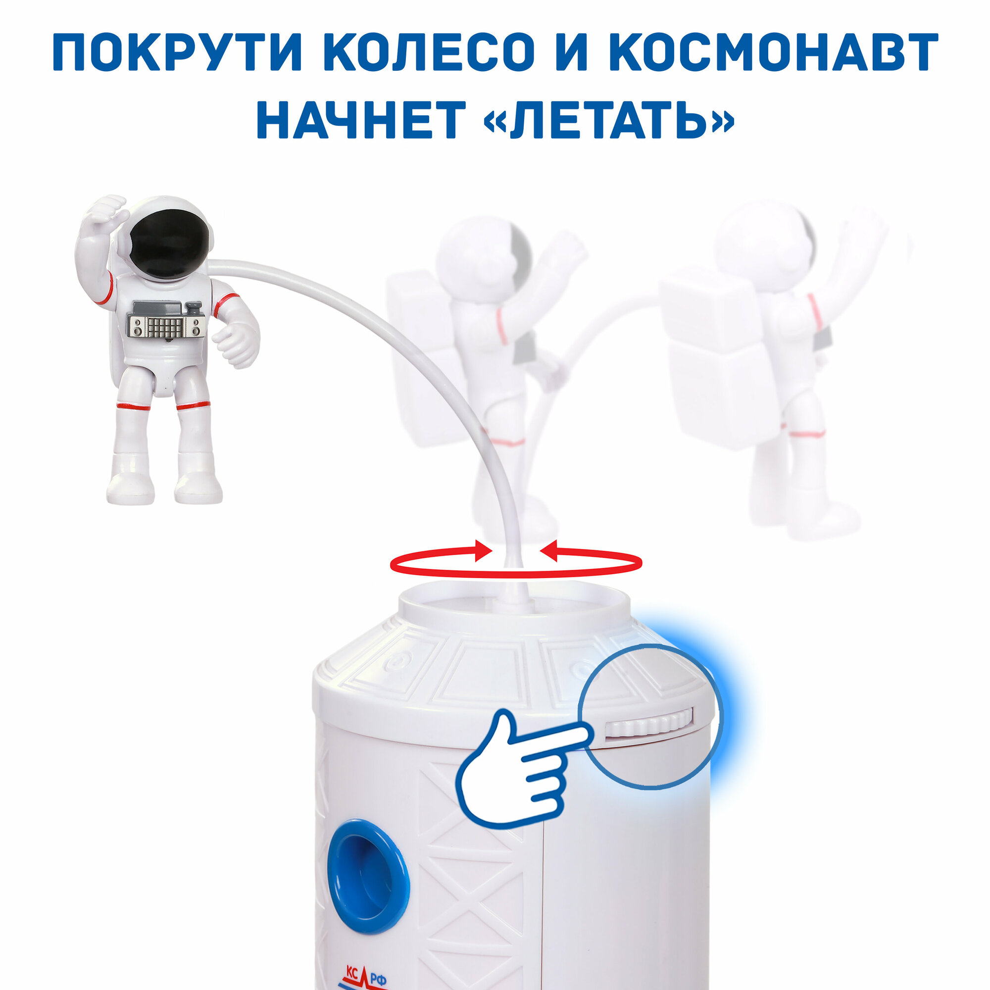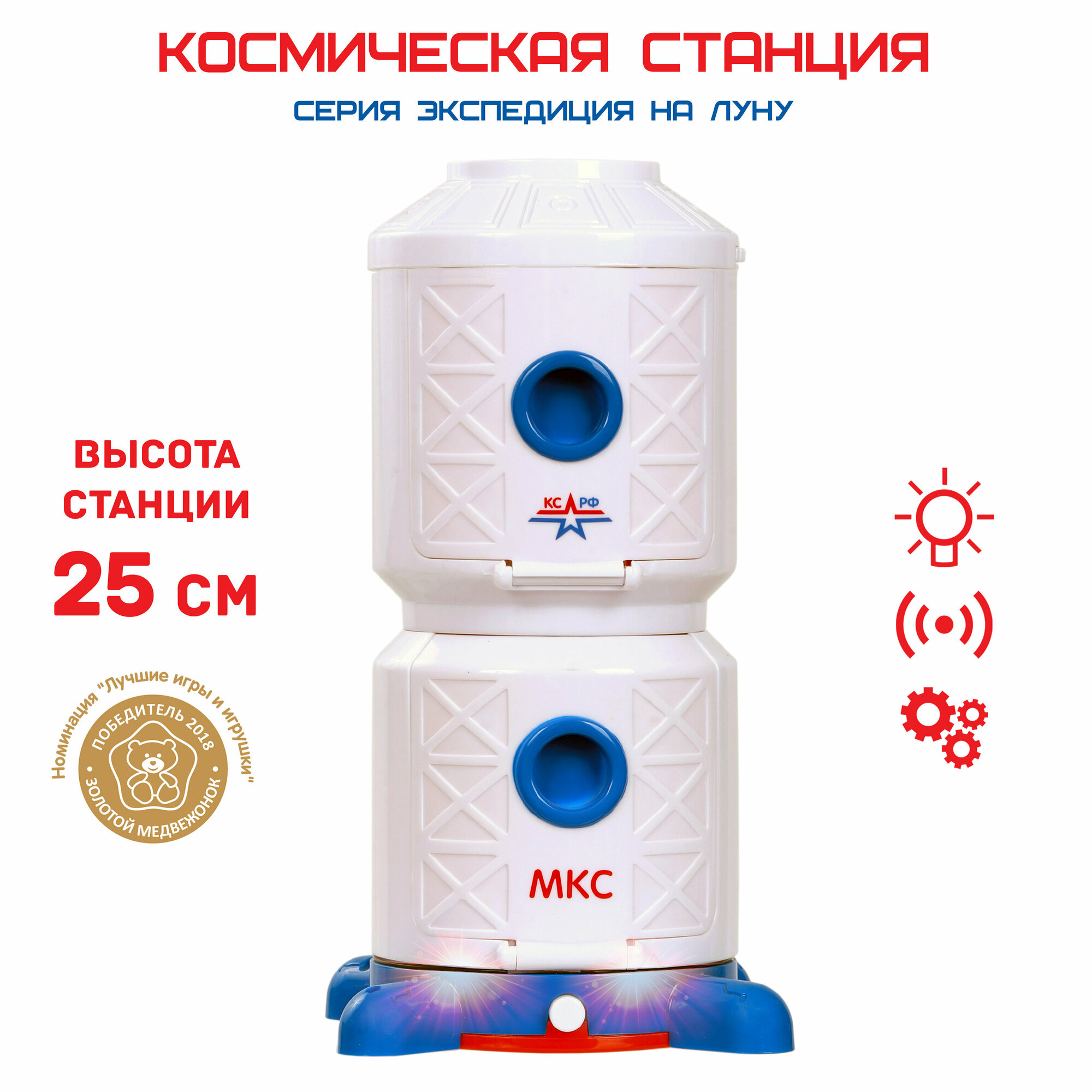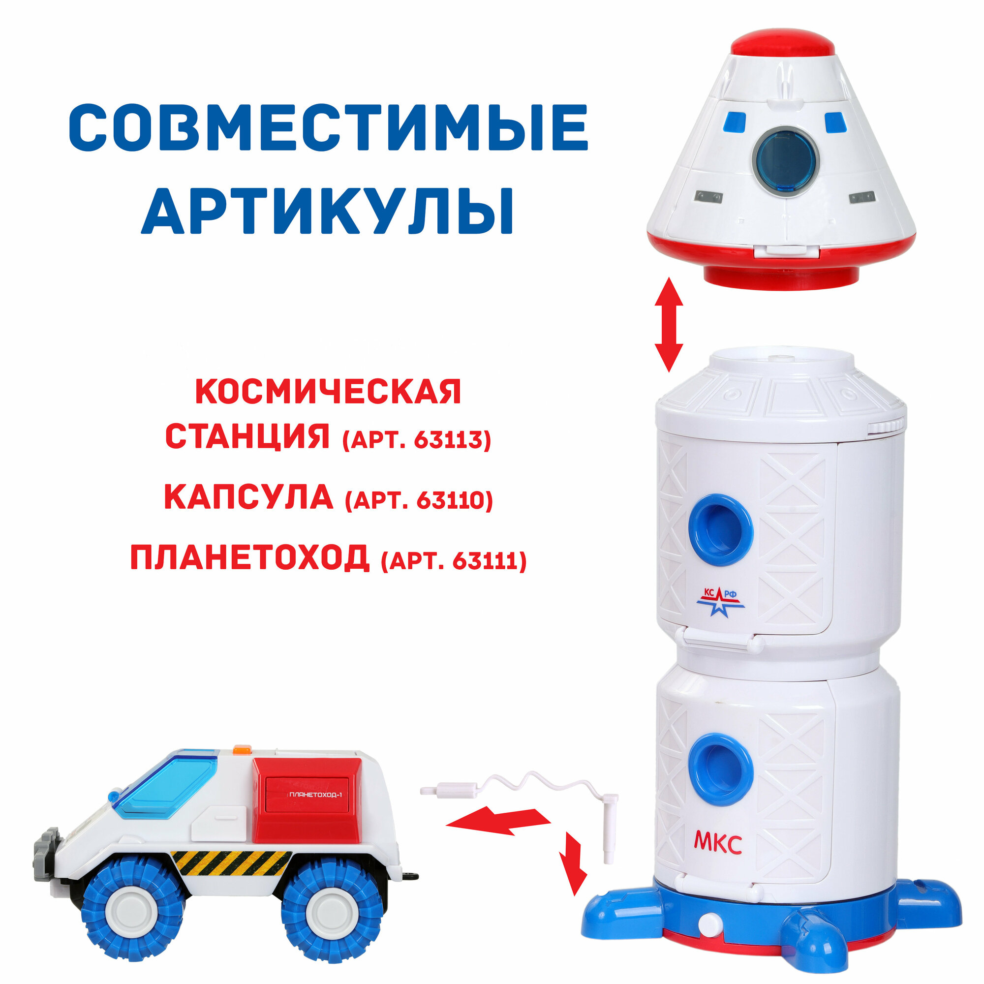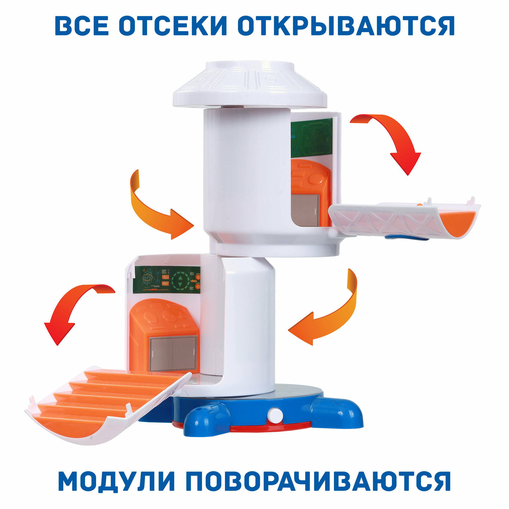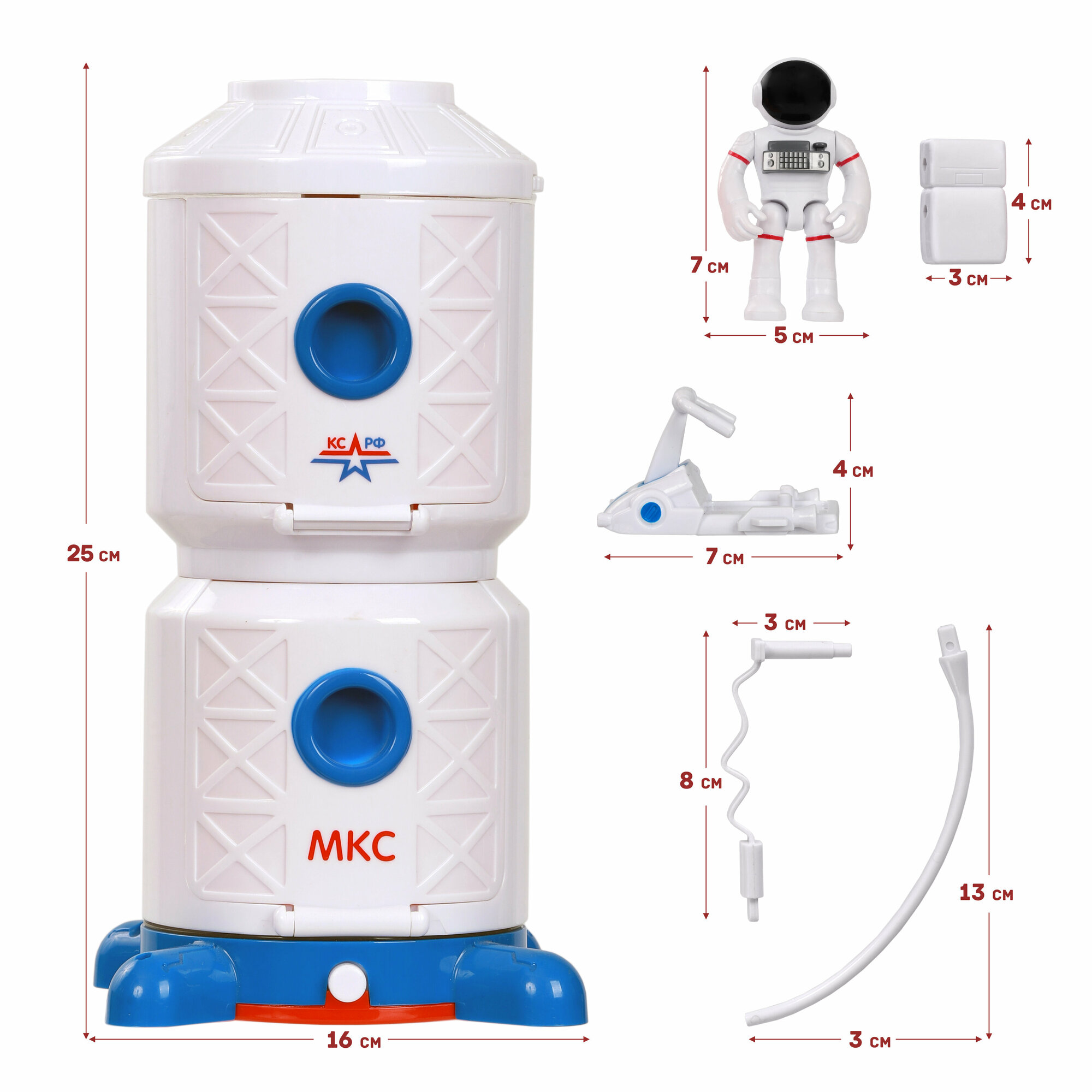 Серия реалистичных космических игрушек. Игрушка выполнена с детальными проработками. Станция состоит из двух отсеков. Отсеки станции открывается, выдвигается лестница. Если прикрепить космонавта с помощью троса к верхушки станции и покрутить колесико он начнет летать вокруг станции. При нажатии на кнопку световой и звуковой эффект. Можно комбинировать с арт 63110 и арт 63111
