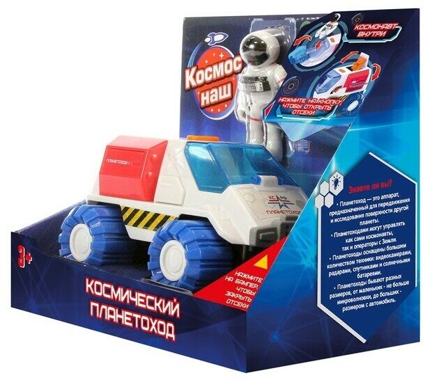 Стать космонавтом — мечта всех советских мальчишек. По прошествии многих лет она не потеряла своей актуальности. Ребята по-прежнему мечтают бороздить просторы Вселенной. Отличный вариант — сделать это с помощью серии реалистичных игрушек «Космос наш». Игрушка выполнена с тщательной проработкой деталей. Кабина планетохода открывается, внутрь можно посадить космонавта.