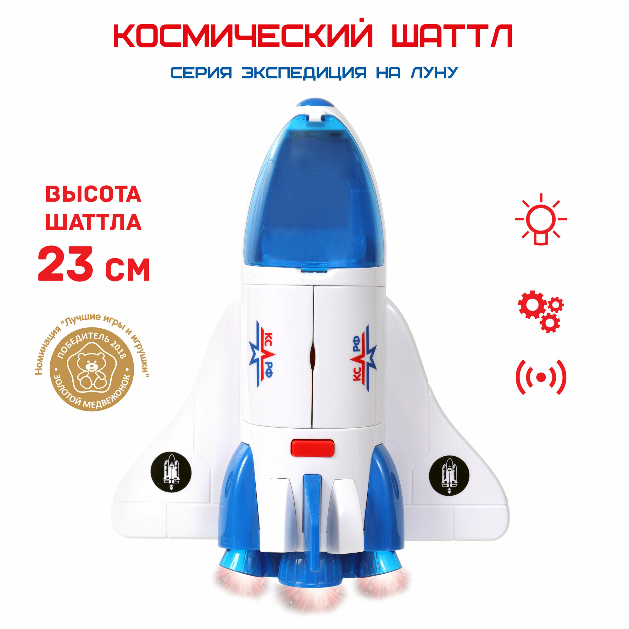 Космос наш Космический шаттл - это игровой набор из серии реалистичных космических игрушек. Шаттл длиной 23 см выполнен с детальными проработками. Отсеки шаттла открываются, и внутрь можно посадить космонавта. При нажатии кнопки - световой и звуковой эффекты. Фигурка космонавта высотой 7,5 см с подвижными руками, ногами и головой входит в набор. Шаттлом можно играть самостоятельно или же состыковать с помощью троса с Космической станцией из серии "Космос наш". С наборами "Космос наш" любой мальчишка почувствует себя отважным покорителем вселенной и первооткрывателем новых звезд и планет.