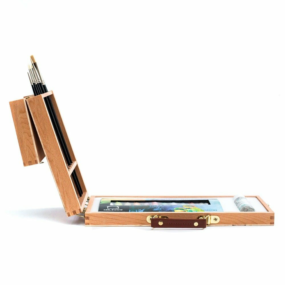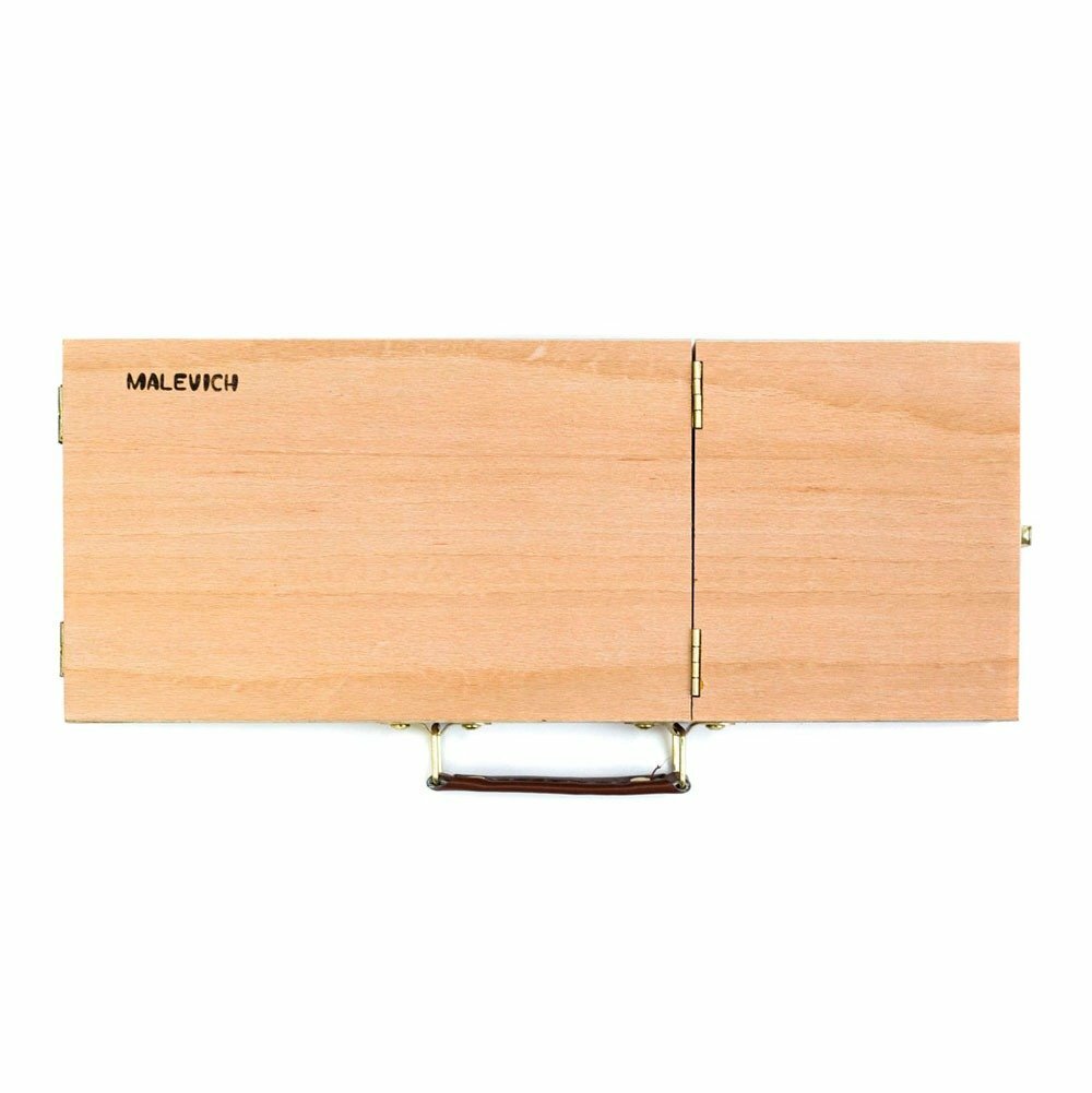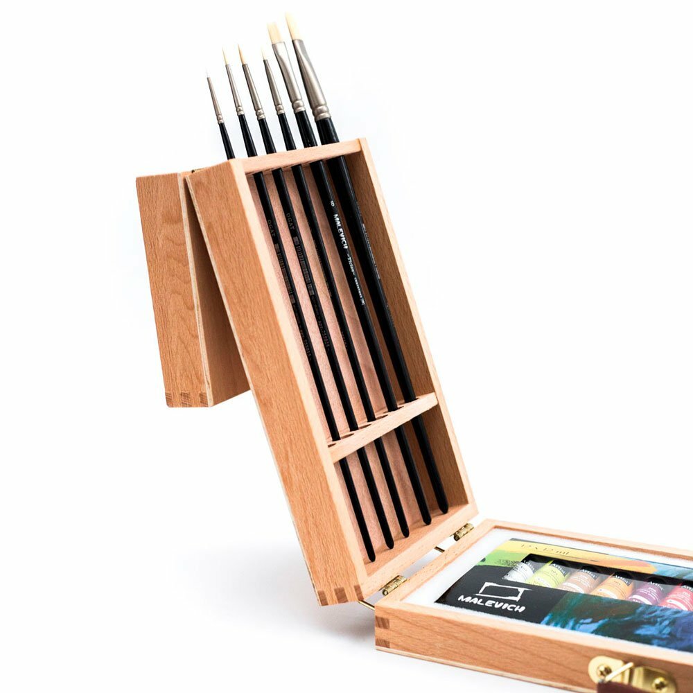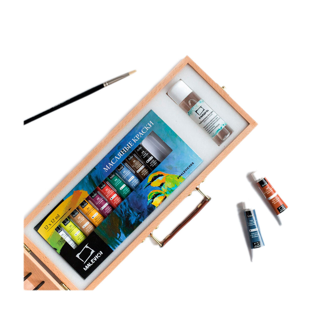 Набор подарочный Малевичъ с масляными красками Тициан, 9 предметов: художественный кейс из бука, набор масляных красок Малевичъ, 12 цв. по 12 мл, кисть из синтетики Tician, круглая №0, кисть из синтетики Tician, круглая №1,5, кисть из синтетики Tician, круглая №2,5, кисть из синтетики Tician, плоская №4, кисть из синтетики Tician, плоская №8, кисть из синтетики Tician, плоская №14, разбавитель без запаха 50 мл. Внимание! Состав может меняться поставщиком без предварительного уведомления!