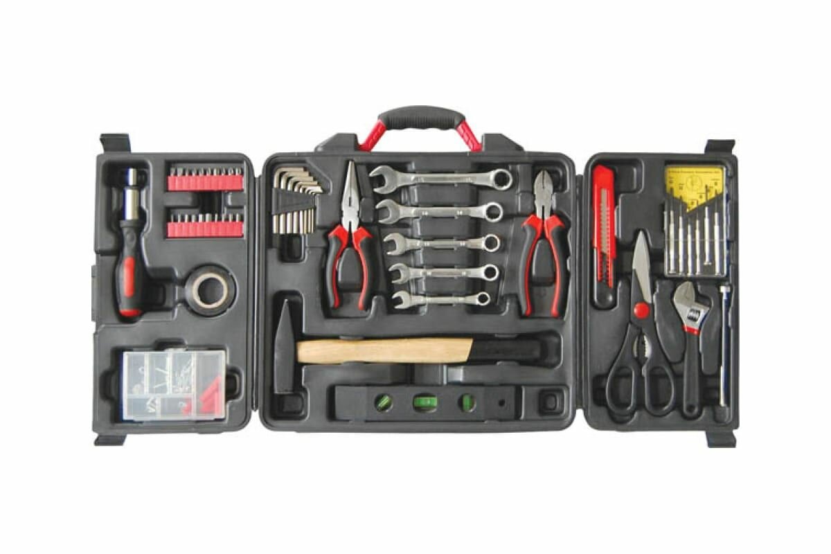 В наборе: тонконосы L=160 мм (1 шт.); бокорезы L=160 мм (1 шт.); ключ разводной L=150 мм (1 шт.); ножницы технические L=200 мм (1 шт.); нож технический, лезвие 18 мм (1 шт.); уровень L=200 мм (1 шт.); отвертки для точных работ: SL: 1.4; 2.0; 2.4; 3 мм, PH0, PH1 (6 шт.); ключи «hex»: 1.5; 2.0; 2.5; 3.0; 4.0; 5.0; 5.5; 6.0 мм (8 шт.); ключи комбинированные: 10; 12; 13; 14; 15 мм (5 шт.); 20 бит: SL5, SL6, PH0, PH1, PH2, PH3, PZ1, PZ2, PZ3, HEX2, HEX3, HEX4, HEX5, HEX6, HEX7, T10, T15, T20, T30; отвертка реверсивная (1 шт.); изолента PVC (1 шт.); молоток 300 гр. (1 шт.); набор крепежа (гвозди, саморезы, клеммы, кнопки) (91 шт.); магнит телескопический (1 шт.). Материал: термообработанная инструментальная сталь, биты и отвертки из хром-ванадиевой стали. Упаковка: пластиковый чемодан.