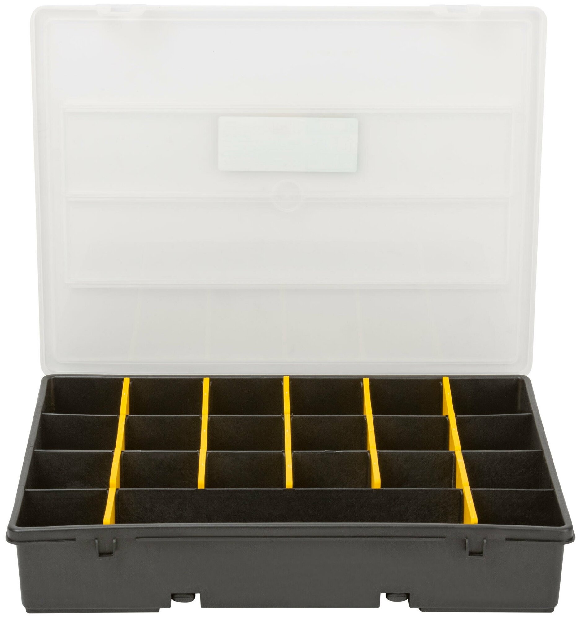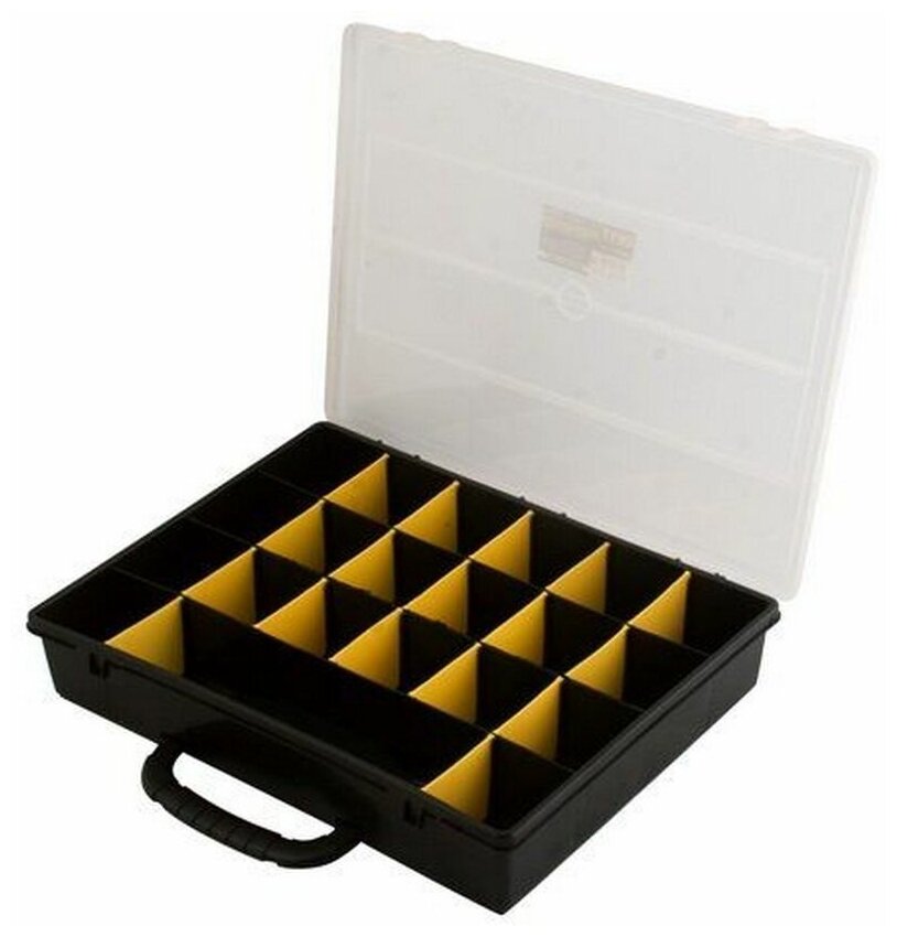 Органайзер для фурнитуры FIT изготавливается из пластика и имеет прозрачную верхнюю крышку, позволяющую видеть содержимое всех внутренних отсеков. Преимуществом этого бокса для мелких предметов являются вошедшие в комплект переставные перегородки, за счет которых вы сможете оптимизировать внутреннее пространство изделия по своему усмотрению. Крышку органайзера для упорядоченного хранения мелких предметов удерживает в закрытом положении надежный пластиковый замок. Благодаря складной ручке из пластика этот практичный бокс решает задачу не только хранения, но и удобной переноски необходимых вам рабочих принадлежностей и аксессуаров.