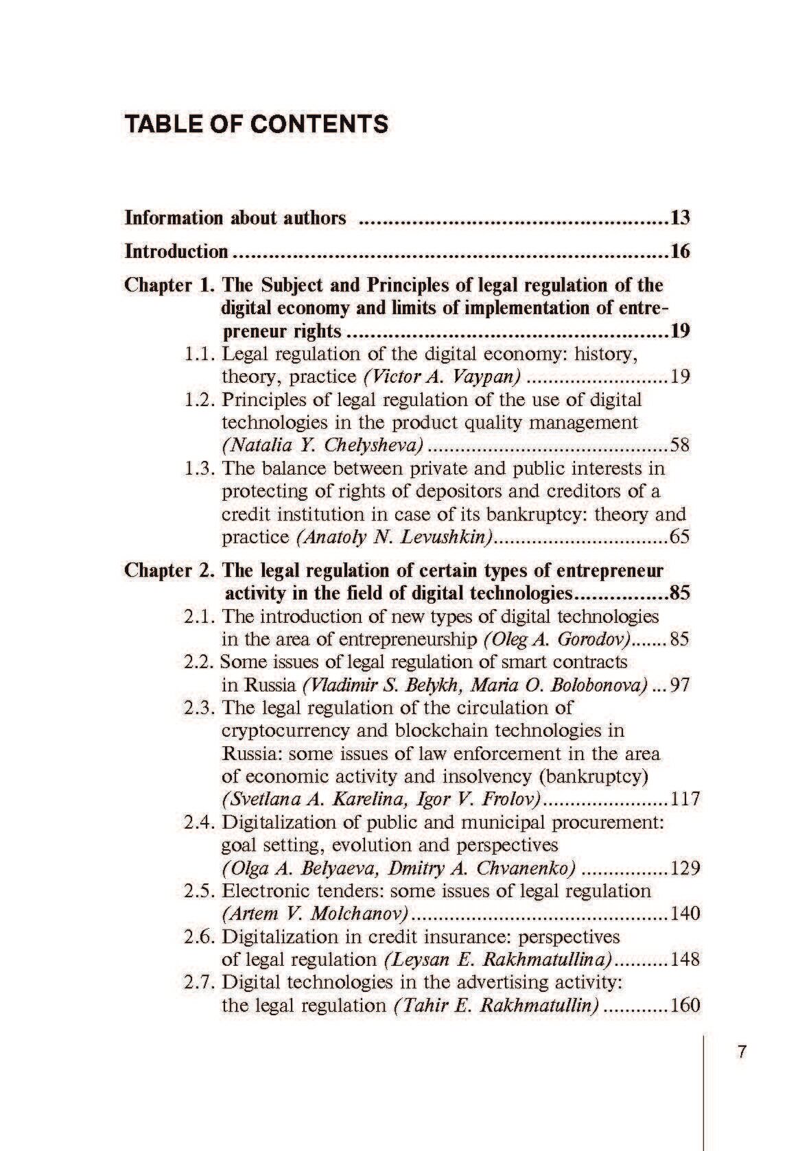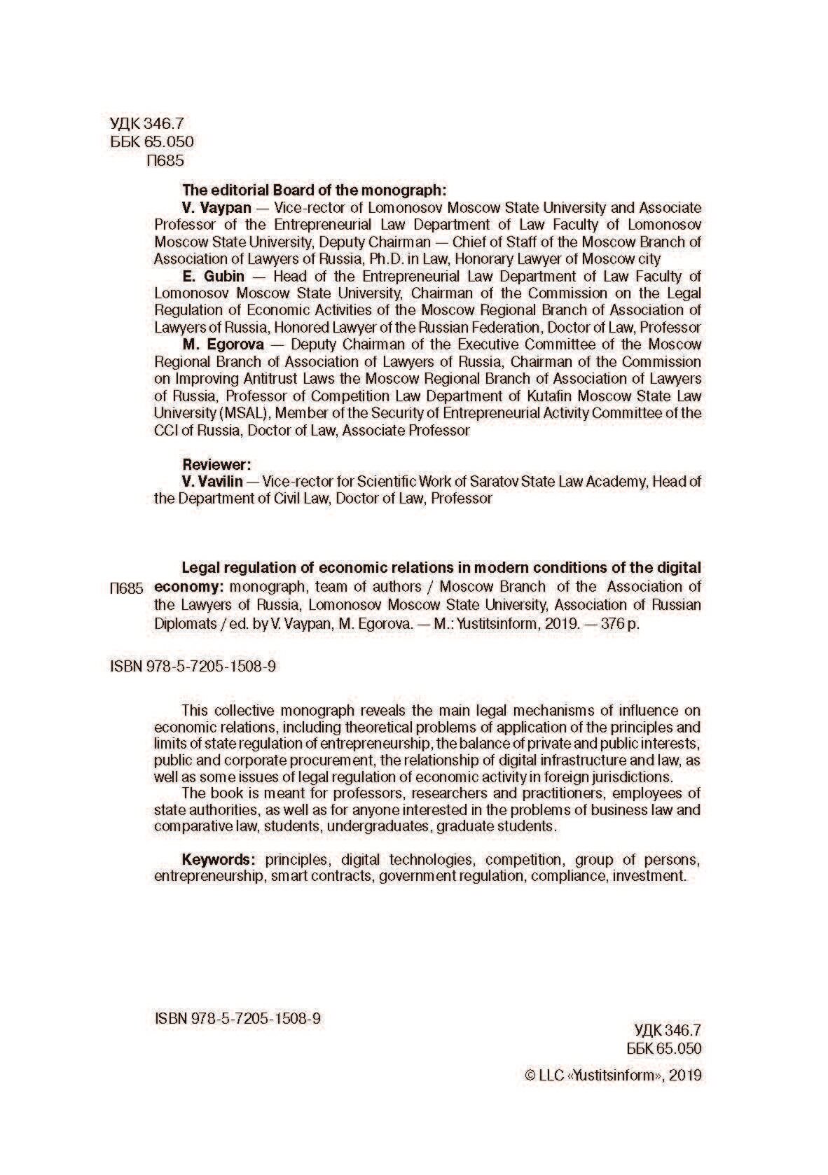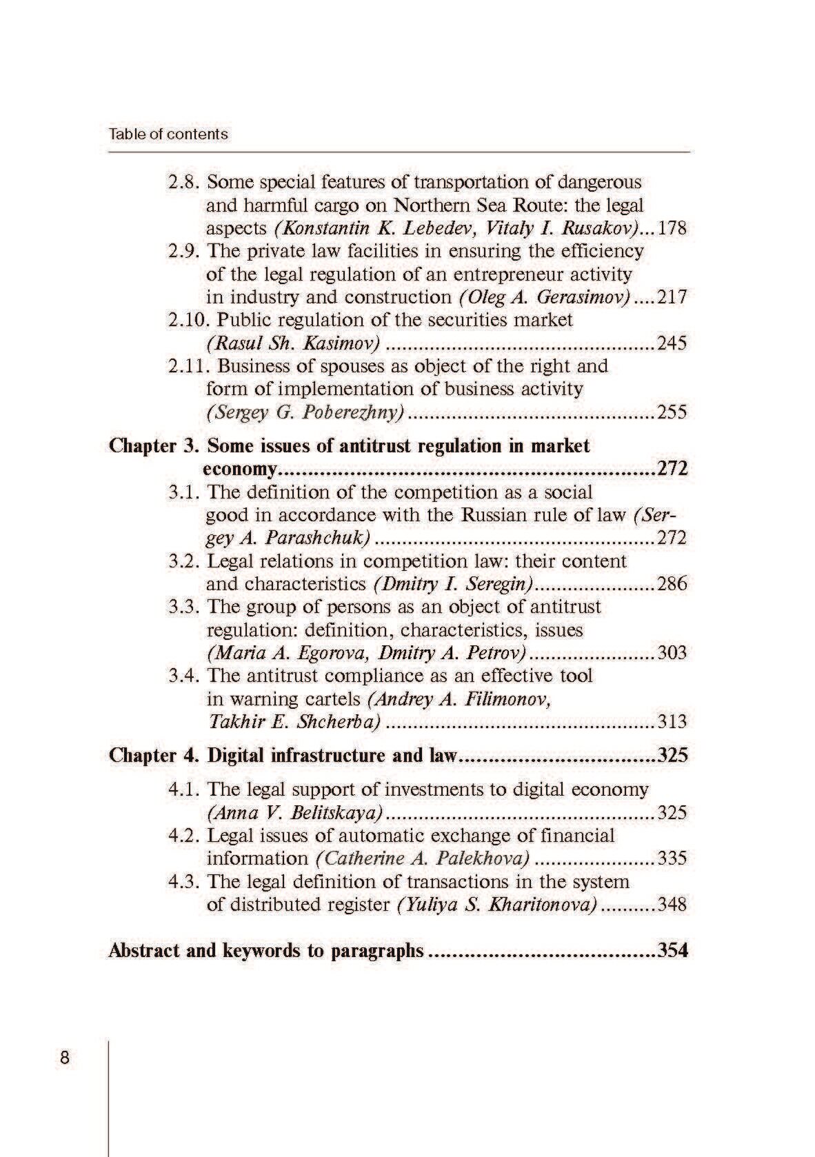 предпринимательства, соотношения частных и публичных интересов, публичных и корпоративных закупок, взаимосвязи цифровой инфраструктуры и права, а также некоторые вопросы правового регулирования экономической деятельности в зарубежных юрисдикциях.