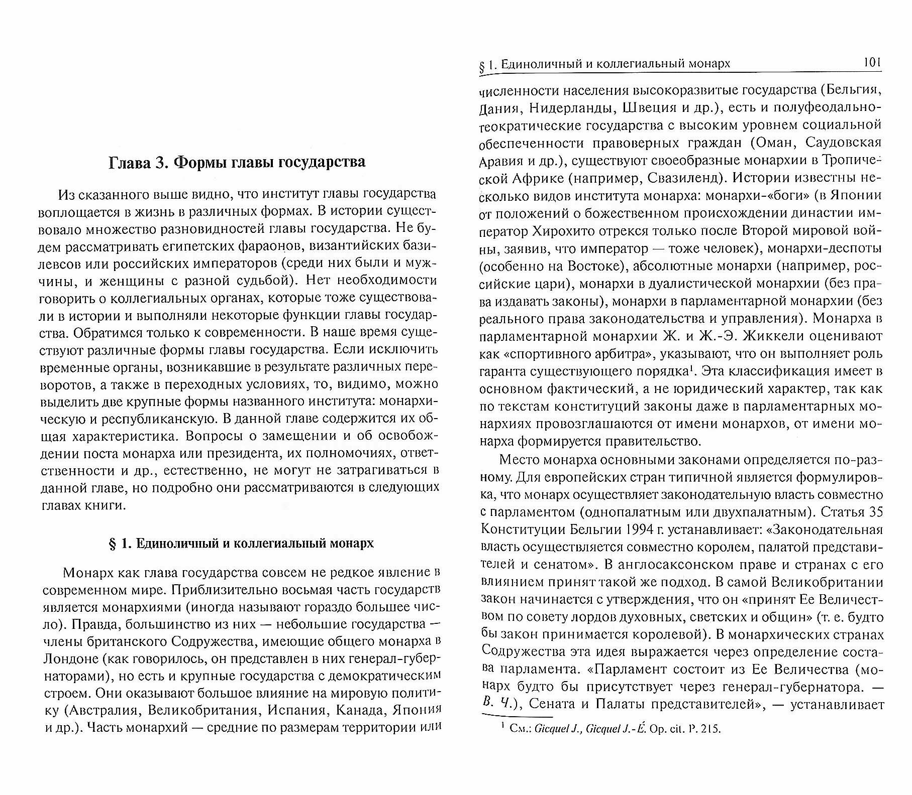 Автор предлагает новую концепцию института главы государства в системе единства государственной власти и разделения ее ветвей. Рассматриваются юридический статус главы государства и его фактическое положение, место в системе разделения властей, разнообразные вилы института главы государства в современных условиях, полномочия, ответственность.
