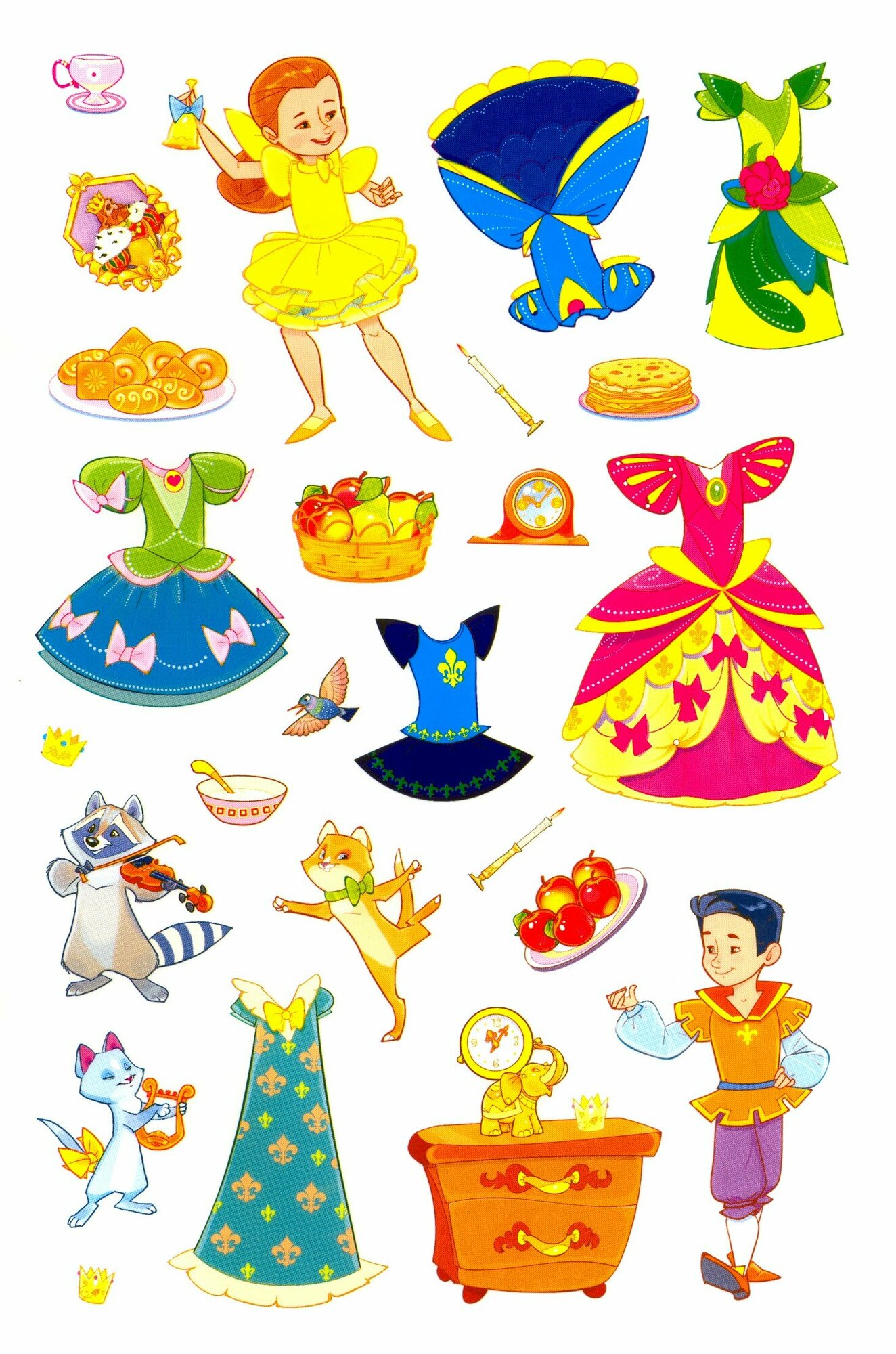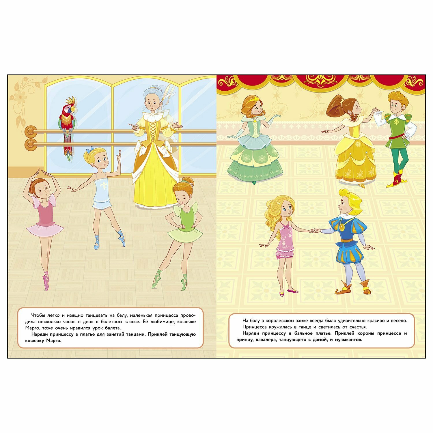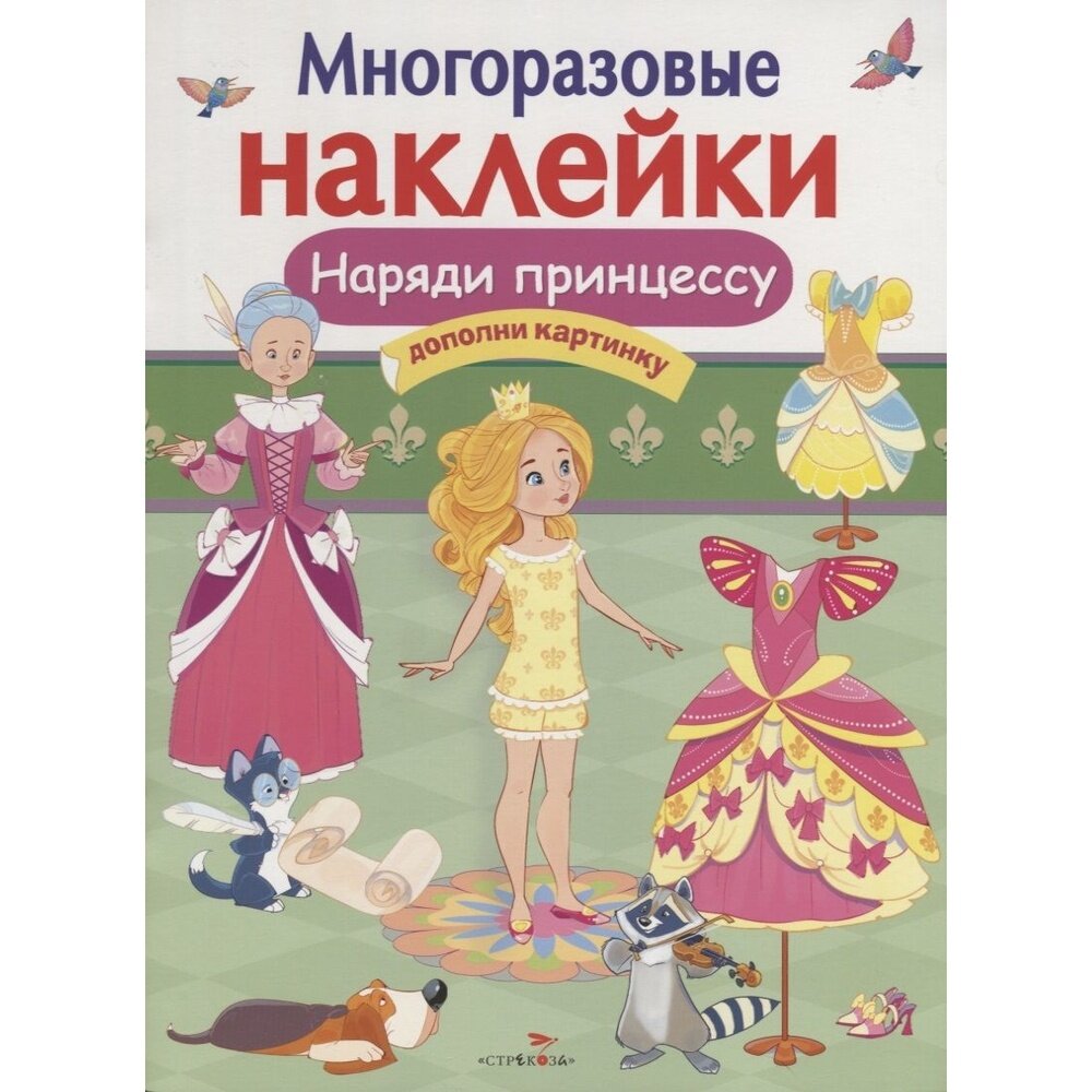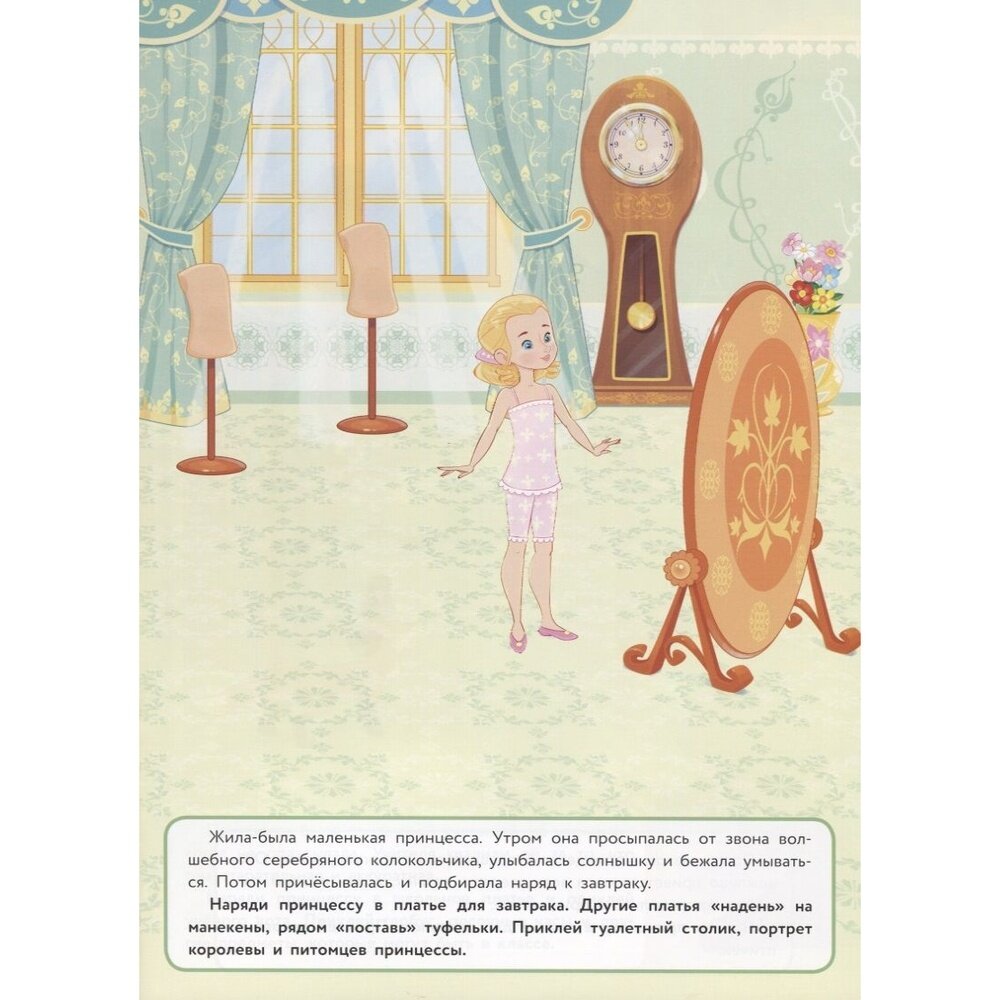 Маленькая принцесса очень любит наряжаться в красивые платья! Помоги ей подобрать наряды для прогулок, занятий и торжественного бала.А яркие многоразовые наклейки помогут тебе в этом!