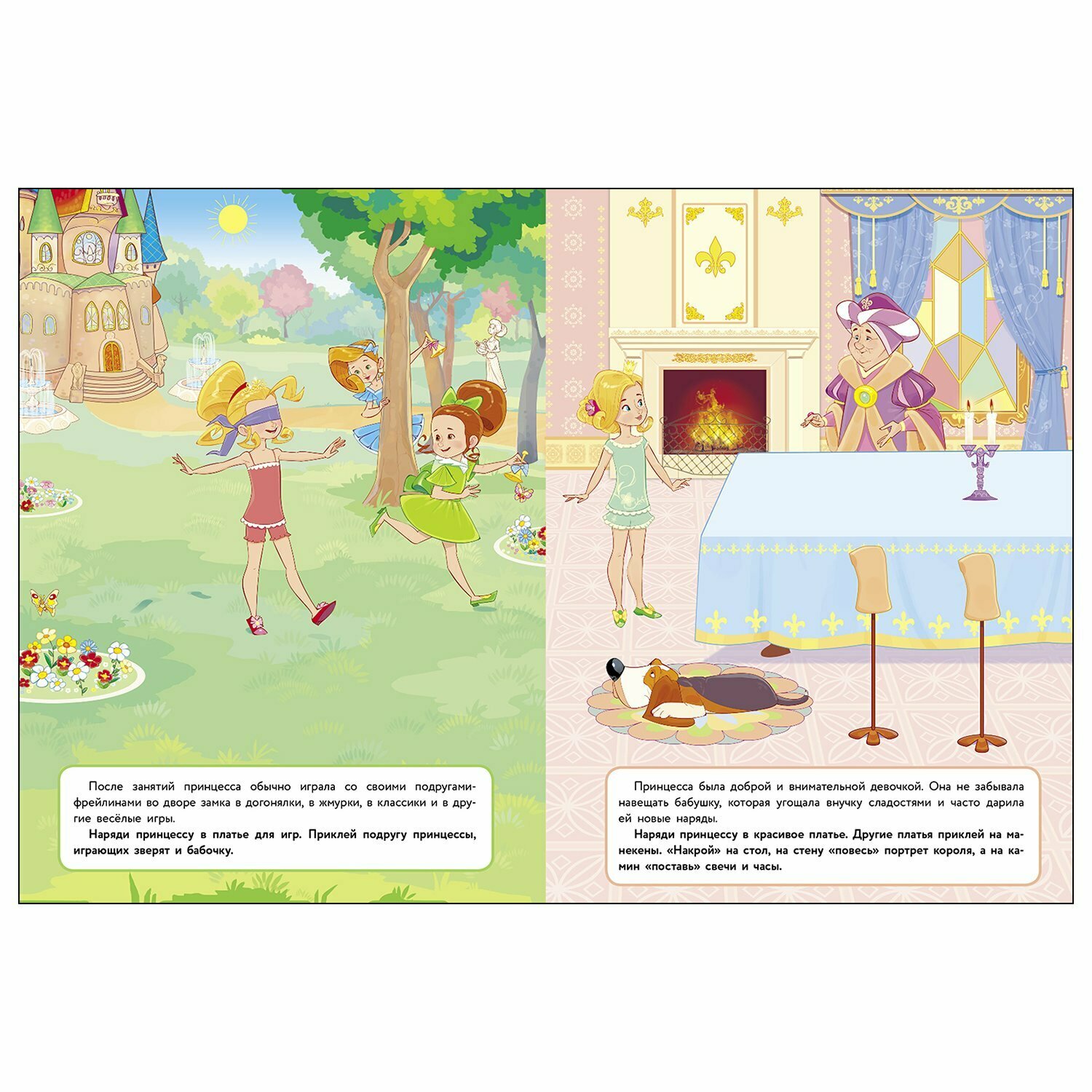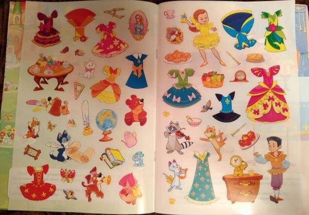 Наклейки неплохие, яркие, действительно многоразовые. На каждой странице небольшое описание происходящего с предложением приклеить что-то конкретное. Вариативность возможна, фактически, только в нарядах принцессы и в незначительных деталях (типа тарелки с яблоками и сладостей).