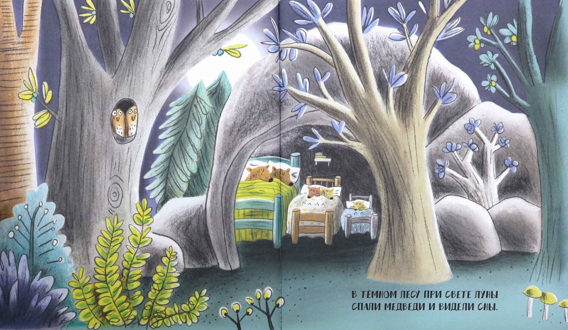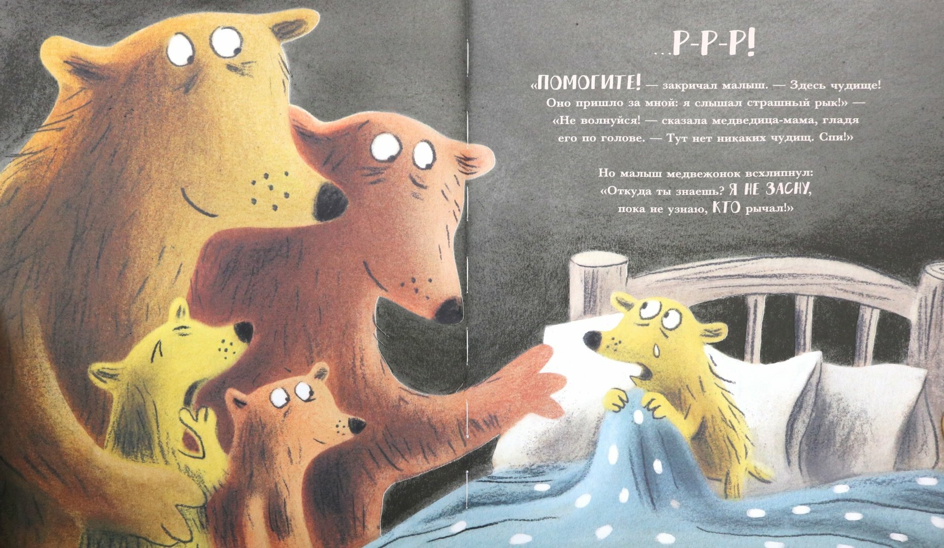 Захватывающая история для самых маленьких о дружном семействе отважных медведей, которые отправляются на поиски страшного чудища, разбудившего малыша-медвежонка. Путешествие весёлого медвежьего семейства по ночному лесу полно неожиданных и совсем не страшных встреч, и медвежонок с папой-медведем вместе учатся храбрости.