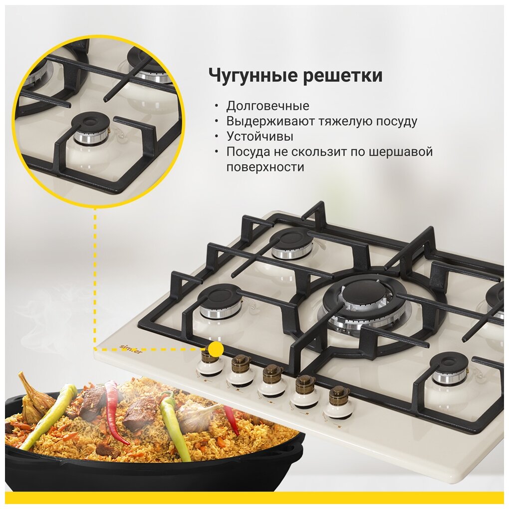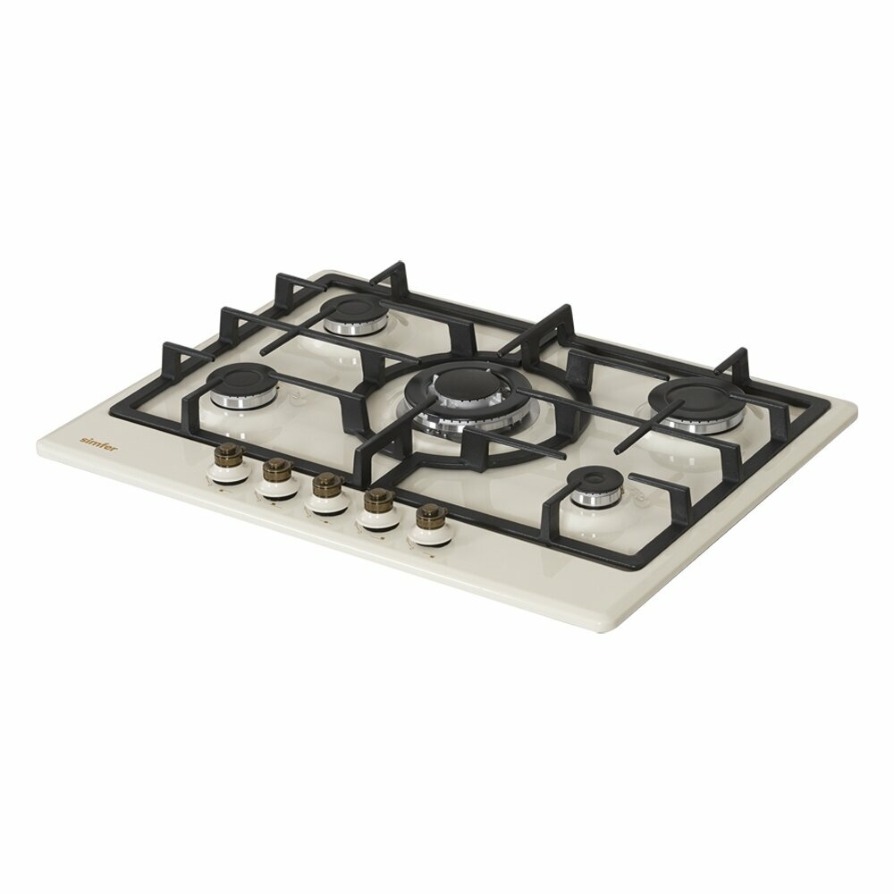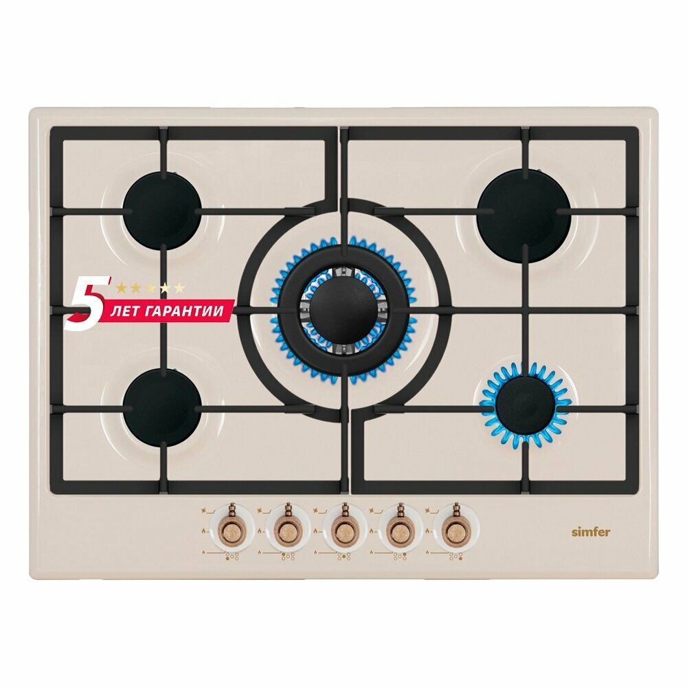 Техника для дома Simfer Газовая варочная поверхность Simfer выполнена в стиле Ретро. Модель оснащена 5 конфорками, одна из них WOK. Электроподжиг осуществляется при помощи поворотной ручки. Предусмотрен газ-контроль.