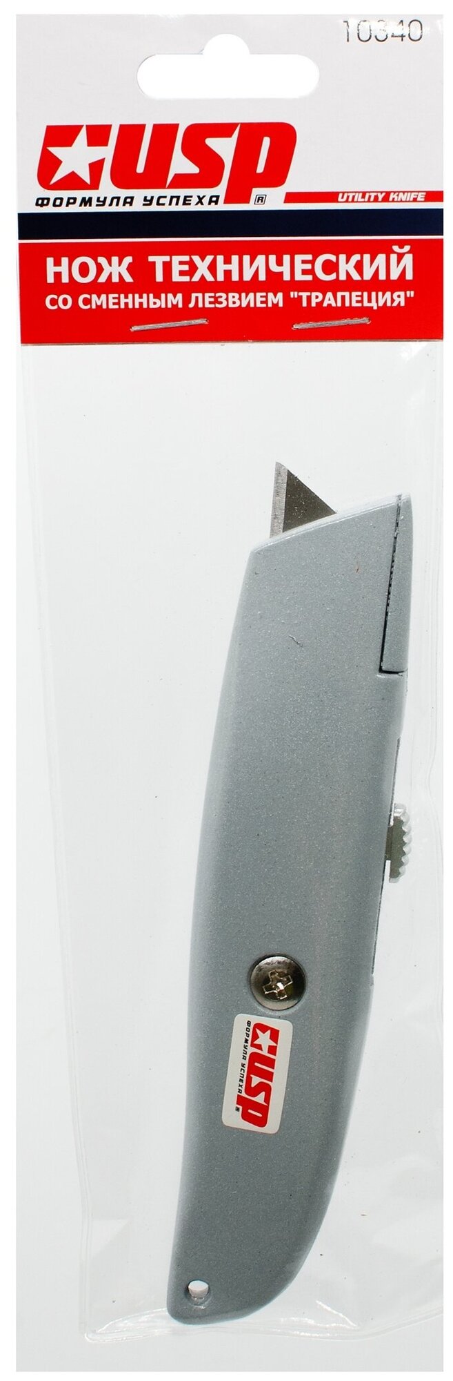 Для резки напольных покрытий. Материал: трапециевидное лезвие из инструментальной стали, металлический корпус. Упаковка: блистер.