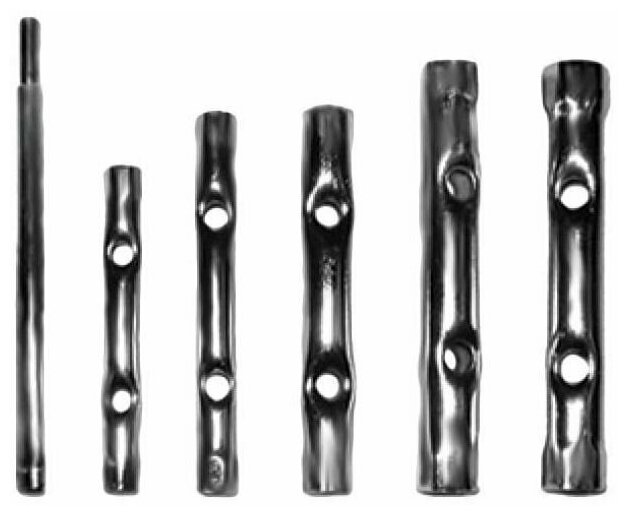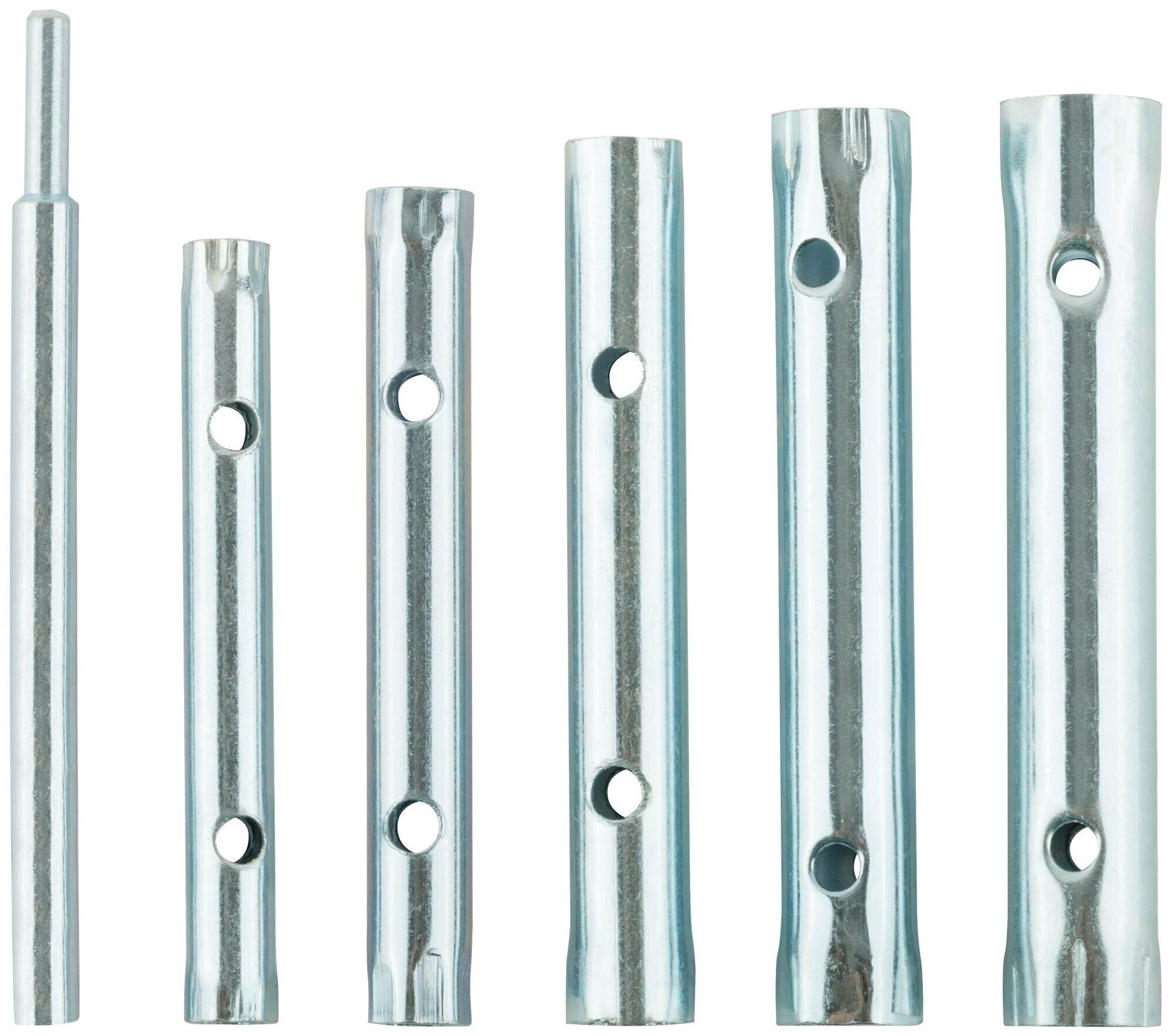 Ключи трубчатые Fit , 8-17 мм, набор 6 шт. предназначен для работ с крепежом в труднодоступных местах. Трубчатые торцевые ключи особенно удобны при извлечении и установке болтов и гаек в глубоких колодцах. Ключи изготовлены из качественной инструментальной стали, что обеспечивает износостойкость и долгий срок службы инструмента. 6 ключей разных размеров в наборе обеспечивают широкий спектр применения.Преимущества Изготовлены из термообработанной инструментальной стали и обладают высокой прочностью и износостойкостью Дополнительный рычаг в комплекте способствует облегчению и повышению эффективности в работе Цинковое покрытие предотвращает коррозию