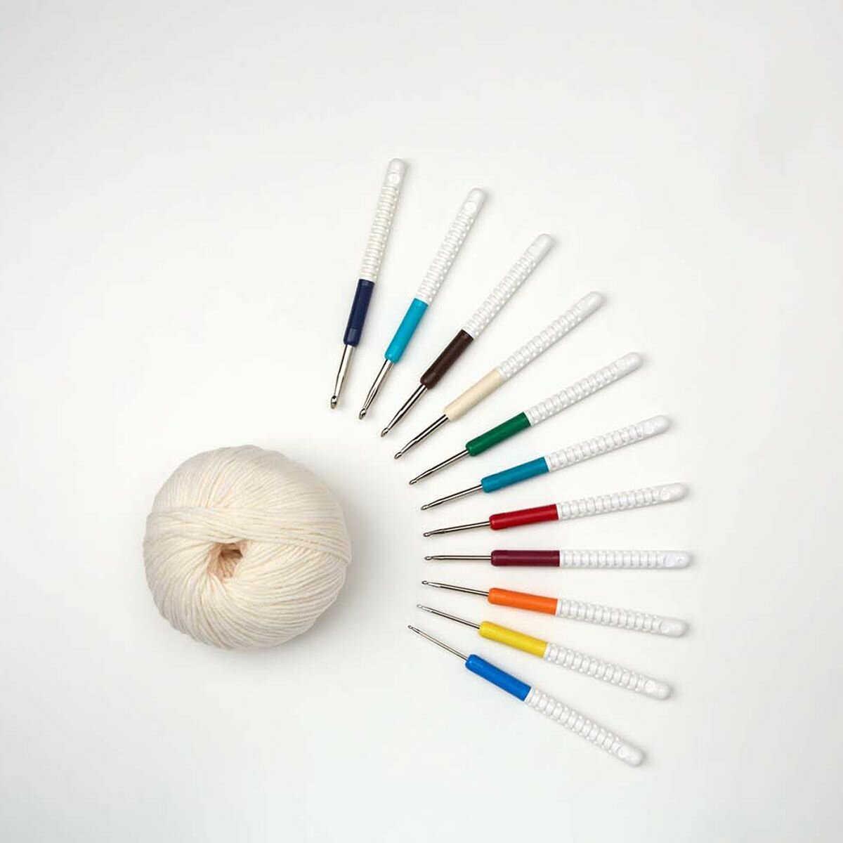 Больше товаров на нашем сайте: Отправка по всей России Это классика. Цвет ручки означает толщину крючка – очень удобно для потребителей. Номер крючка нанесен на поверхность прессом и остается на вечно. Усиленная и удлиненная ручка расслабляет руку. Так как многие любят вязать летом, была разработана специальная рифленая ручка. При вязании рука меньше потеет, так как воздух проникает в щели между крючком и ладонью, кожа руки лучше дышит. Артикул 148-7 идеально подходит для различных крючковых техник вязания. Размеры от 2 мм до 6 мм, выполненные из высококачественного пластика. Для детей или начинающих эти крючки идеальны из-за своей невысокой стоимости.
